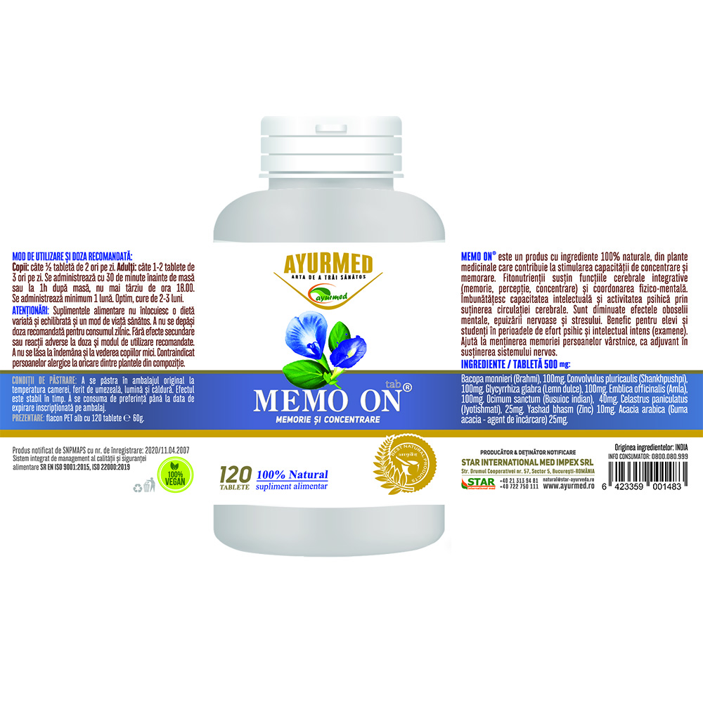 Bacopa monnieri (Brahmi), extract din parti aeriene (8:1) 100mg, Convolvulus pluricaulis (Shankhpushpi), extract din parti aeriene (8:1) 100mg. Glycyrrhiza glabra (Lemn dulce), pulbere din radācina 100mg, Emblica officinalis (Amla), pulbere din fructe 100mg, Ocimum sanctum (Busuioc indian), extract din parti aeriene (5:1) 40mg. Celastrus paniculatus (Jyotishmati), extract din seminte (10:1) 25mg. Yashad bhasm (Zinc) 10mg, Acacia arabica (Guma acacia- agent de incarcare) 25mg.