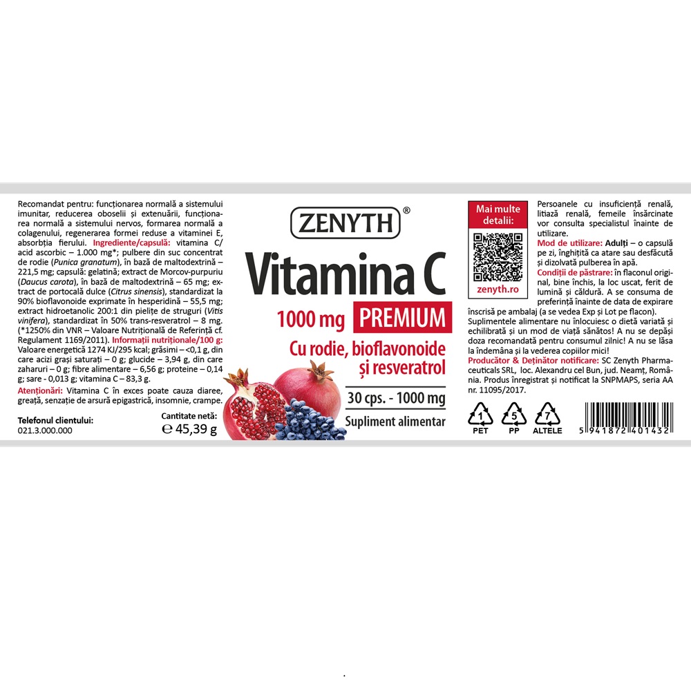 Vitamina C/acid ascorbic – 1.000 mg (*1250% din VNR – Valoare Nutrițională de Referință), pulbere din suc concentrat de rodie (Punica granatum), în bază de maltodextrină – 221,5 mg, capsulă: gelatină, extract de Morcov-purpuriu (Daucus carota), în bază de maltodextrină – 65 mg, extract de portocală dulce (Citrus sinensis), standardizat la 90% bioflavonoide exprimate în hesperidină – 55,5 mg, extract hidroetanolic 200:1 din pielițe de struguri (Vitis vinifera), standardizat în 50% trans-resveratrol – 8 mg.