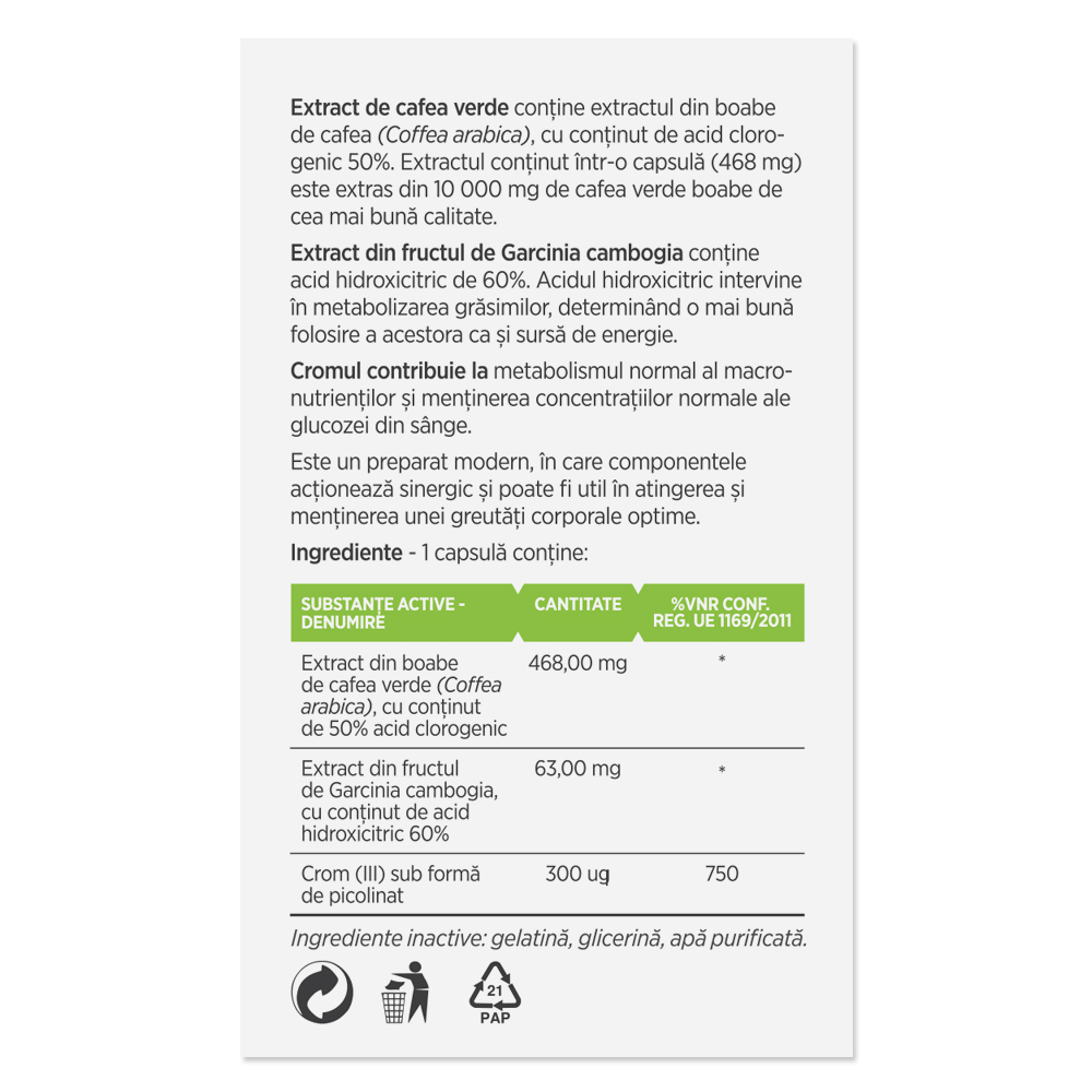 extract din boabe de cafea verde (Coffea arabica), cu continut de 50% acid clorogenic 468.00mg, extract din frcutul de Garcinia Cambogia, cu continut de acid hidroxicitric 60% - 63.00mg si Crom (III) sub forma de picolinat 300 ug.