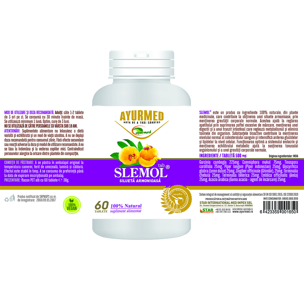 Garcinia cambogia 225mg. Commiphora mukul 75mg. Tinospora cordifolia 25mg. Piper longum (Piper indonezian) 25mg. Glycyrrhiza glabra (Lemn dulce) 25mg. Zingiber officinale (Ghimbir), 25mg. Terminalia chebula 25mg. Terminalia belerica 25mg. Emblica officinalis (Amla) 25mg. Acacia arabica (Guma acacia - agent de incarcare) 25mg.