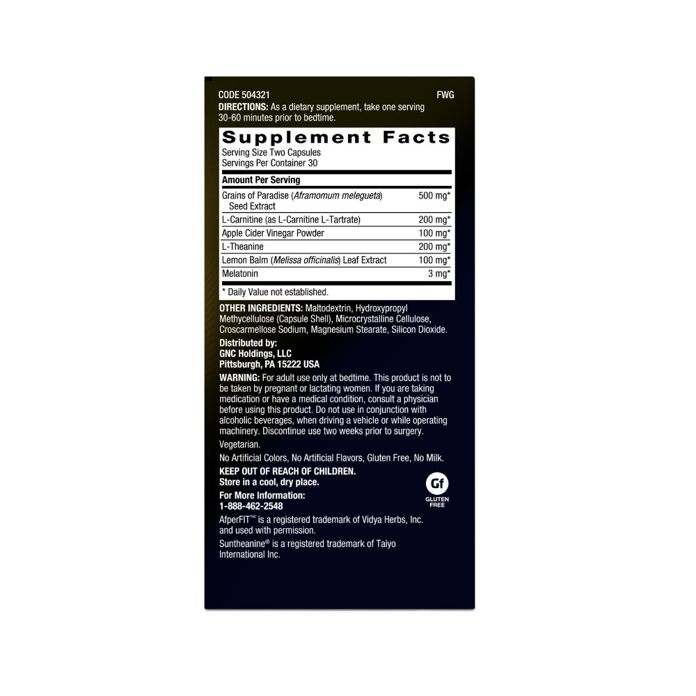 Ingrediente:Extract din seminte de grauntele paradisului, l-carnitina, pudra din otet de mere, l-teanina, extract din frunze de melisa, melatonina, maltodextrina, hidroxipropil metilceluloza (capsula), celuloza microcristalina, croscarmeloza sodica, stearat de magneziu, dioxid de siliciu.