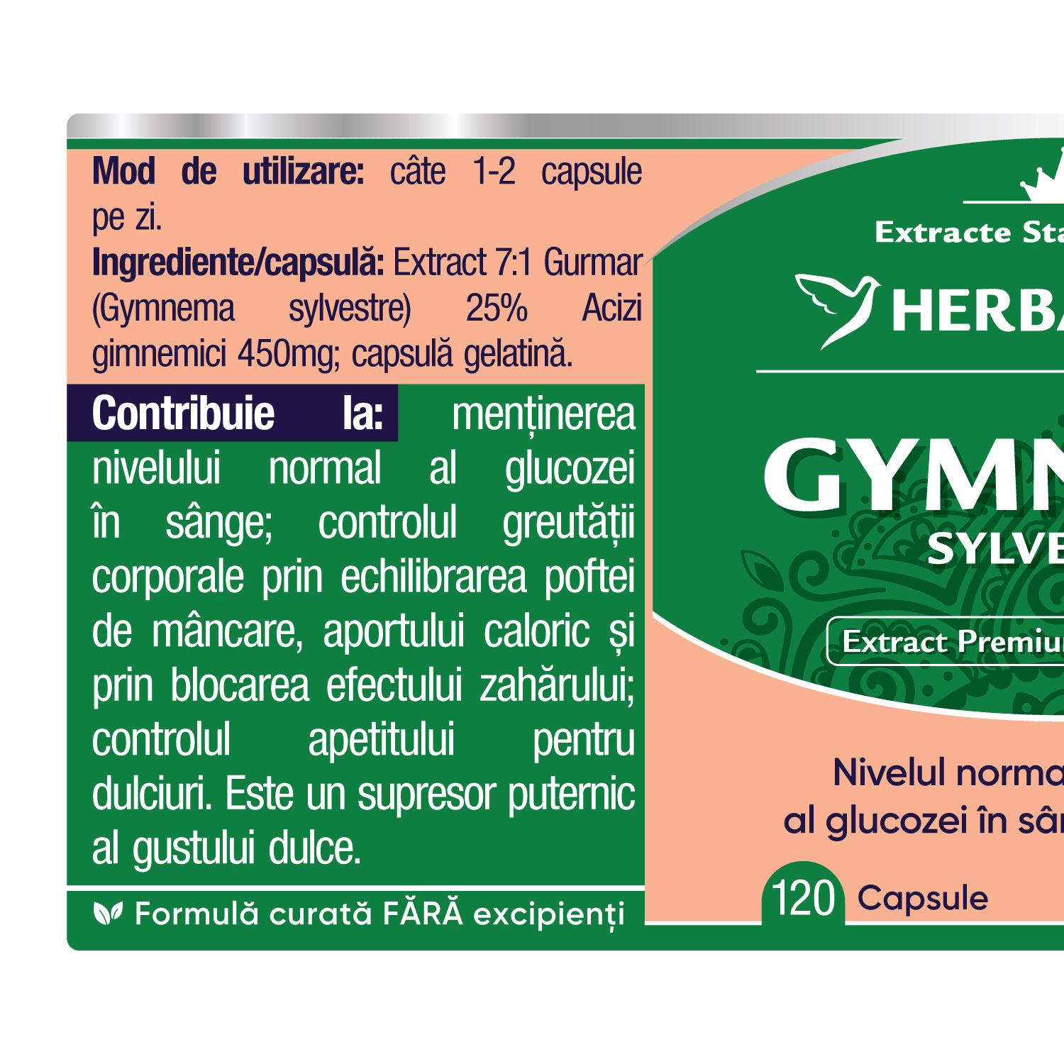 Ingrediente:/capsulă: Extract 7:1 Gurmar (Gymnema sylvestre) 25% Acizi gimnemici 450mg; capsulă gelatină.