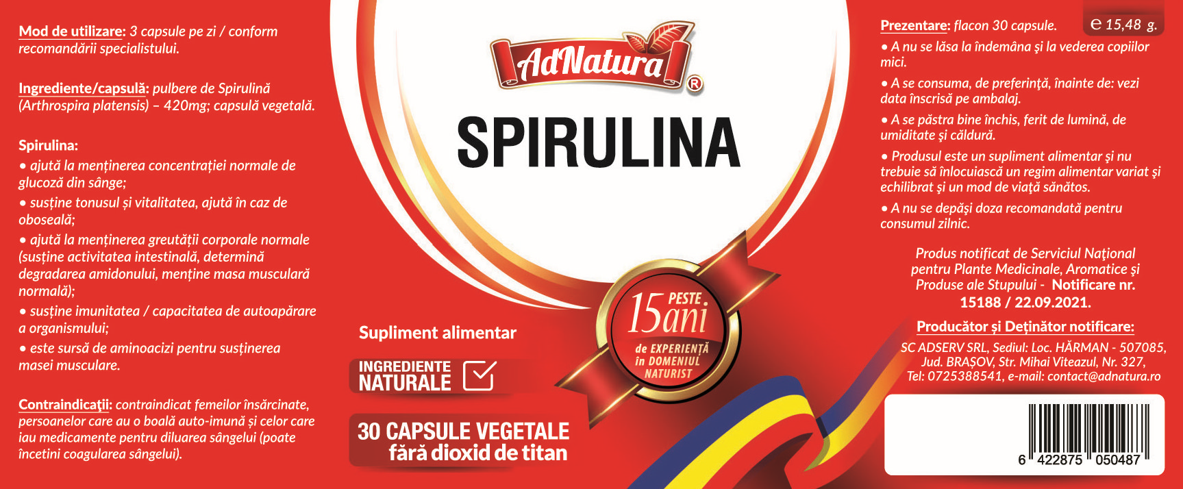 Ingrediente:Per capsulă: pulbere de Spirulină (Arthrospira platensis) - 420mg; capsulä vegetală.