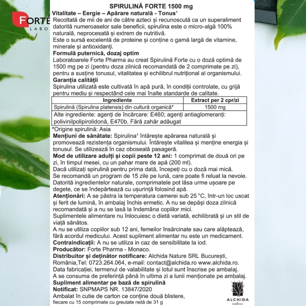 - recoltata de mii de ani de catre azteci si recunoscuta ca un superaliment datorita numeroaselor sale beneficii, spirulina este o micro-alga 100% naturala, neprocesata si extrem de nutritiva;