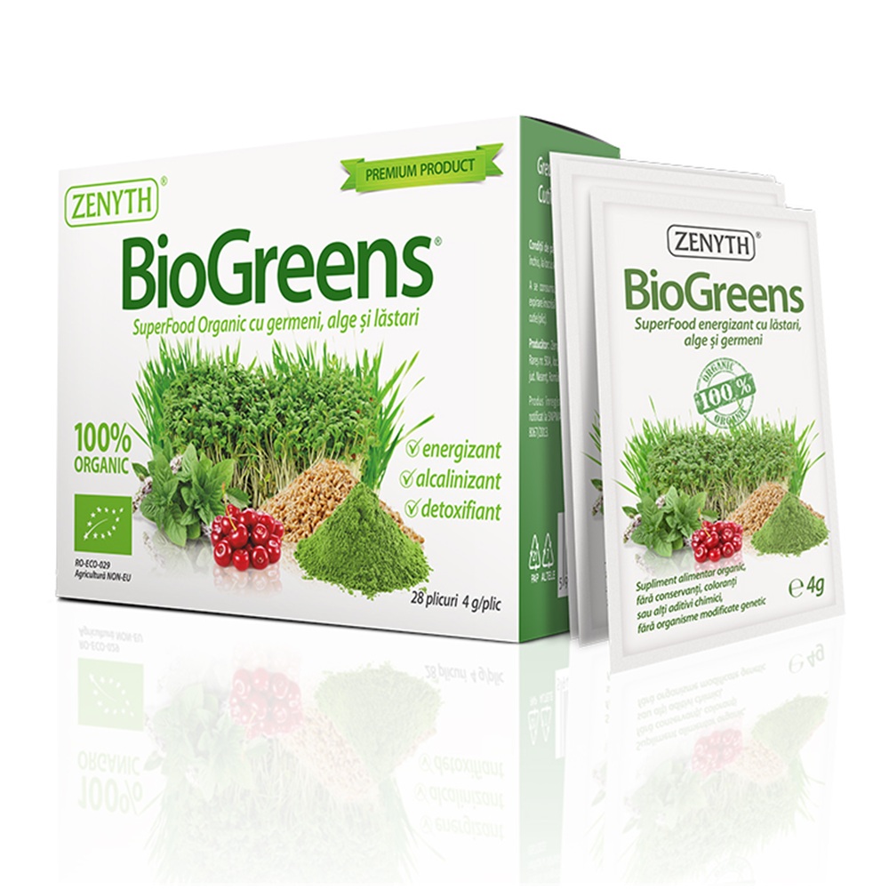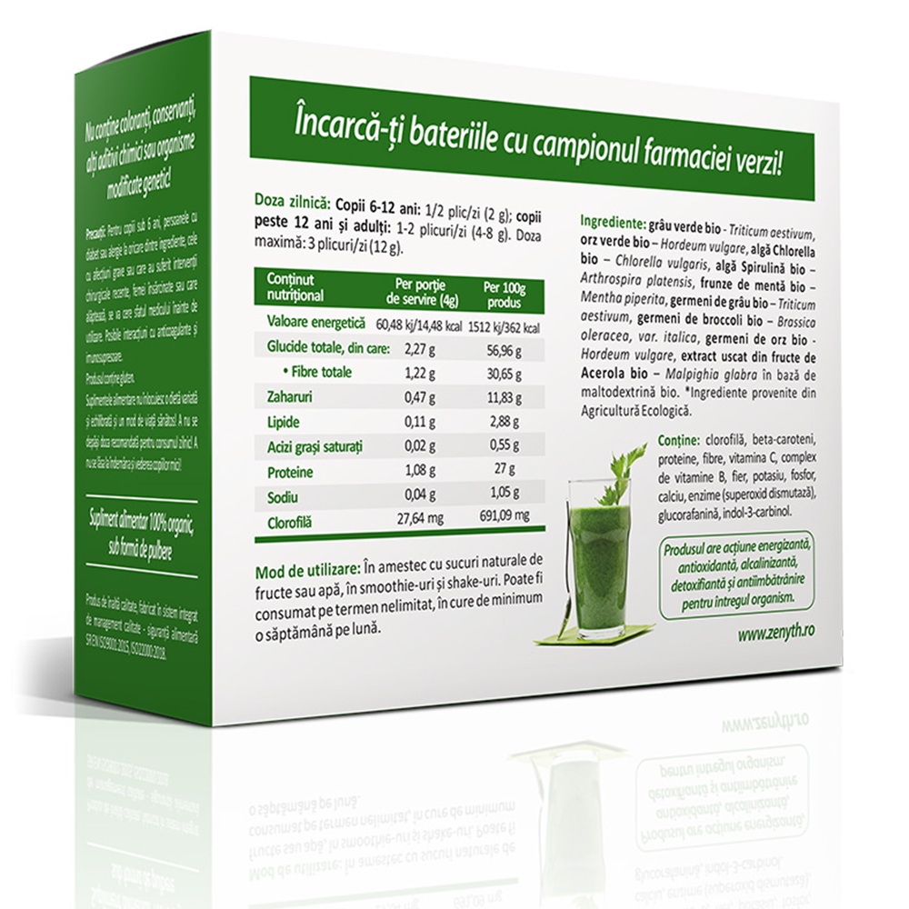 Grâu verde bio (Triticum aestivum), orz verde bio (Hordeum vulgare), algă Chlorella bio (Chlorella vulgaris), algă Spirulină bio (Arthrospira platensis), frunze de mentă bio (Mentha piperita), germeni de grâu bio (Triticum aestivum), germeni de broccoli bio (Brassica oleracea var. italica), germeni de orz bio (Hordeum vulgare), extract uscat din fructe de Acerola bio (Malpighia glabra) în bază de maltodextrină bio.