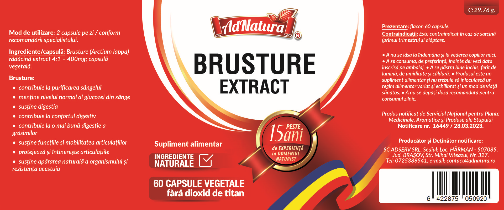 Ingrediente:Per capsulă: Brusture (Arctium lappa) rădăcină extract 4:1-400mg; capsulă vegetală.