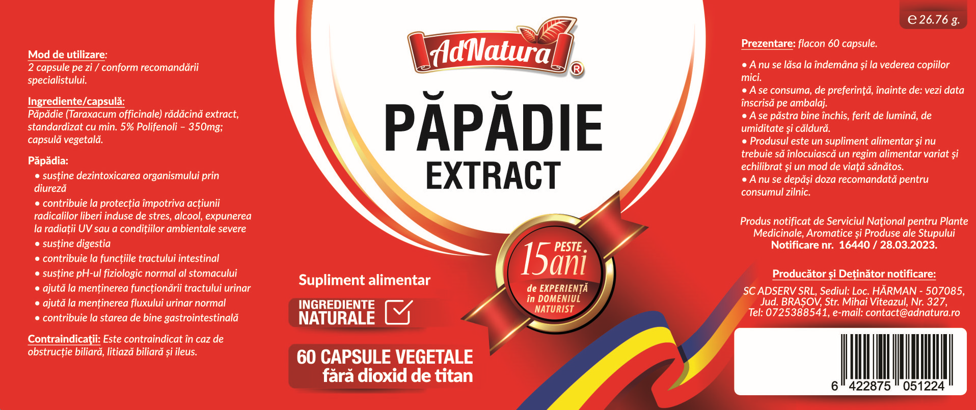 Ingrediente:Per capsula: Păpădie (Taraxacum officinale) rădăcină extract, standardizat cu min. 5% Polifenoli - 350mg; capsulă vegetală.