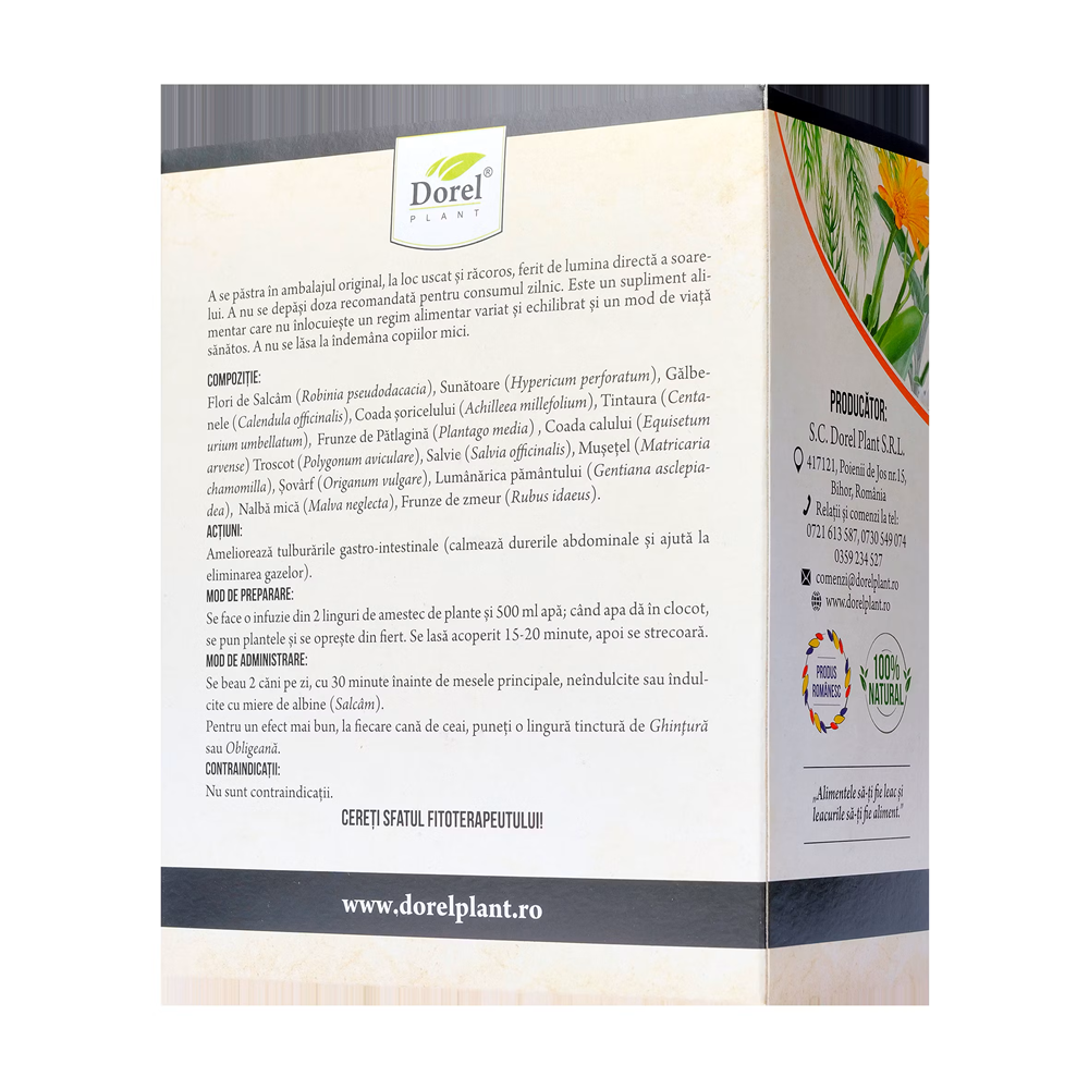 Ingrediente:Flori de Salcâm (Robinia pseudodacacia); Sunătoare (Hypericum perforatum); Gălbenele (Calendula officinalis); Coada şoricelului (Achilleea millefolium); Tintaura (Centaurium umbellatum); Frunze de Pătlagină (Plantago media); Coada calului (Equisetum arvense); Troscot (Polygonum aviculare); Salvie (Salvia officinalis); Muşețel (Matricaria chamomilla); Șovârf (Origanum vulgare); Lumânărica pământului (Gentiana asclepiadea); Nalbă mică (Malva neglecta); Frunze de zmeur (Rubus idaeus).