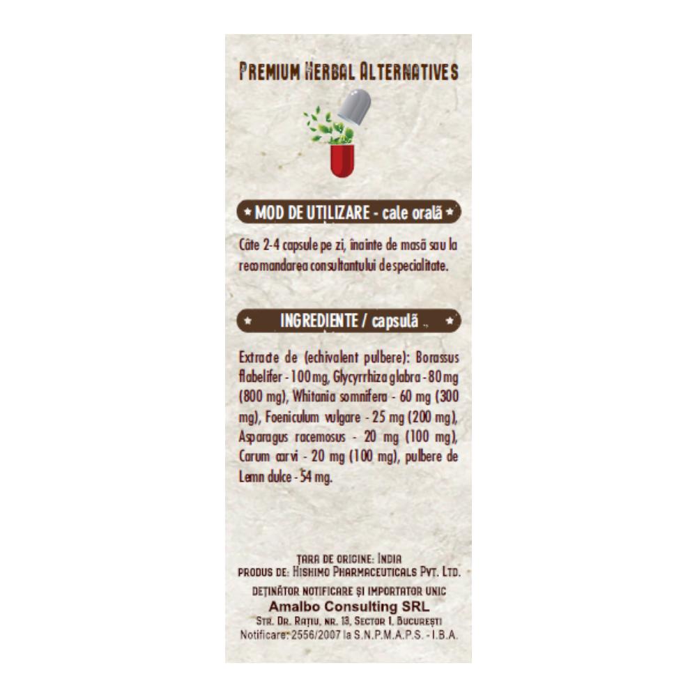 Extracte (echivalent pulbere): Borassus flabellifer 100 mg, Glycyrrhiza glabra – 80 mg (echivalent 800 mg), Withania somnifera 60 mg (echivalent 300 mg), Foeniculum vulgare 25 mg (echivalent 200 mg) , Asparagus racemosus 20 mg (echivalent 100 mg), Carum cavi 20 mg (echivalent 100 mg), pulbere de lemn dulce 54 mg.