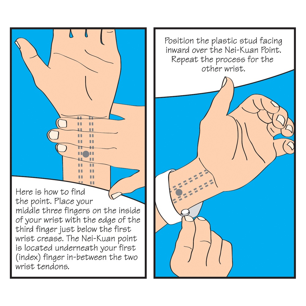 - benzi dintr-un material elastic, purtate la incheietura mainii, care actioneaza prin apasarea punctului de presopunctura Nei-Kuan de pe fiecare incheietura a bratelor cu o semisfera de plastic;