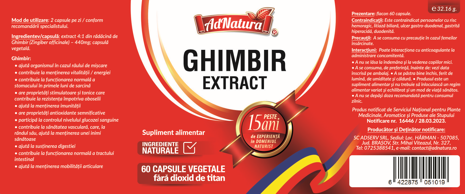 Ingrediente:Per capsulă: extract 4:1 din rădăcină de Ghimbir (Zingiber officinale) - 440mg: capsula vegetală.