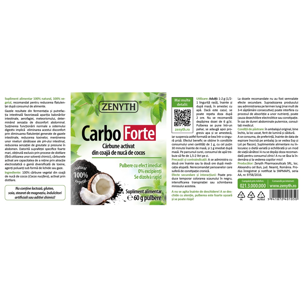 Carbune activat din coaja de nuca de cocos Carbo Forte 60 g Zenyth(100% natural si vegetal) face parte din categoria supliment alimentar , contine ingrediente activecarbune medicinal .