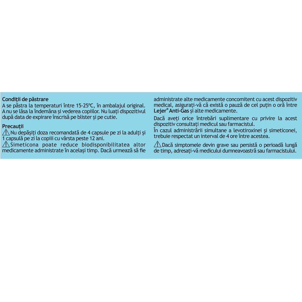 Simeticona poate reduce biodisponibilitatea altor medicamente administrate în același timp. Dacă urmează să fie administrate alte medicamente concomitent cu acest dispozitiv medical, asigurați-vă că există o pauză de cel puțin o oră între Lejer Anti-Gas și alte medicamente.