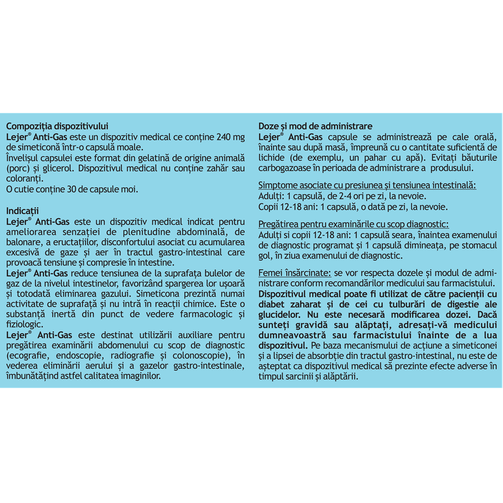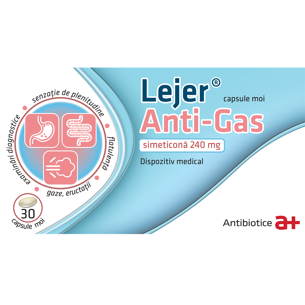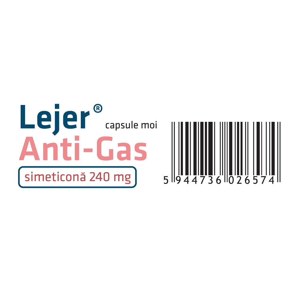 - Compoziția dispozitivului ®Lejer Anti-Gas este un dispozitiv medical ce conține 240 mg de simeticonă într-o capsulă moale.