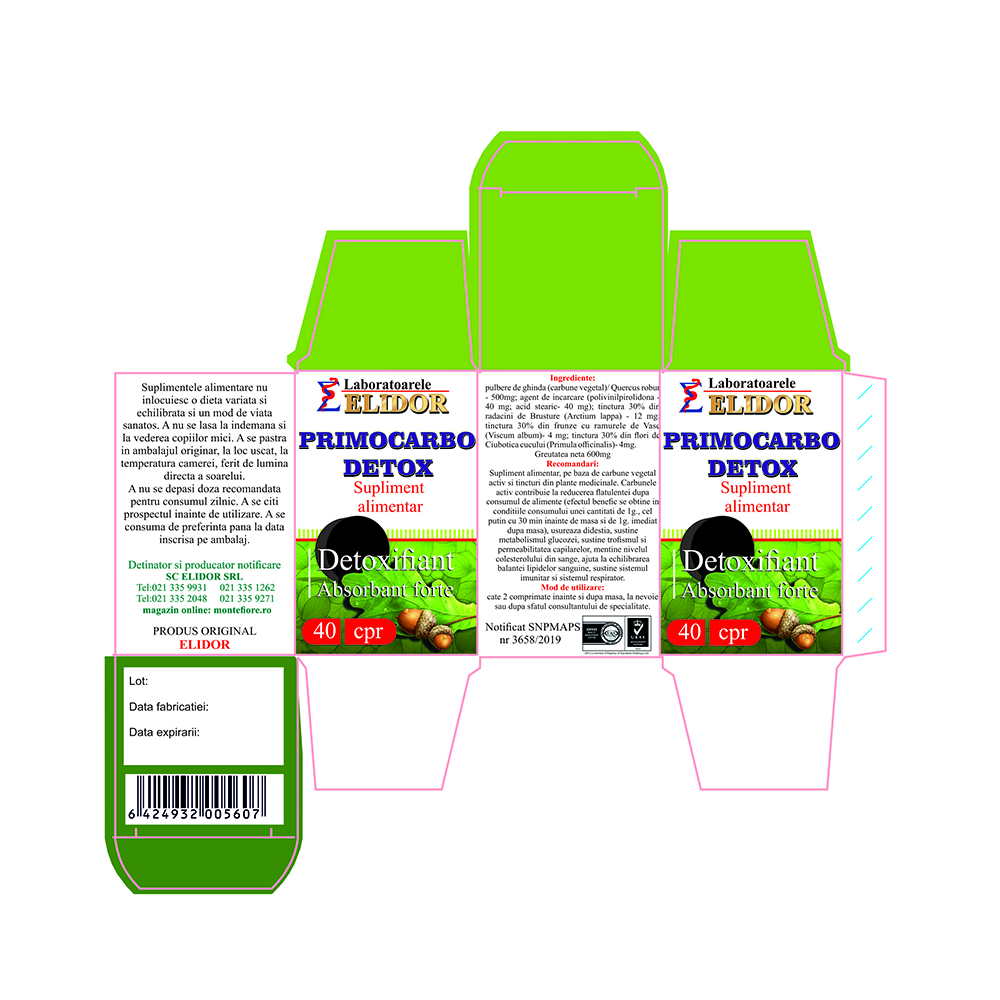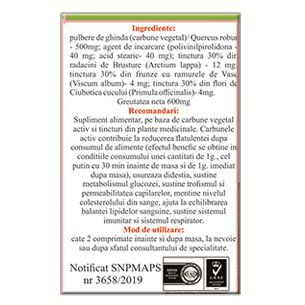 Ingrediente:Pulbere de ghinda (carbune vegetal) Quercus robur – 500 mg, Agent de incarcare (polivinilpirolidona 40 mg, Acid stearic 40 mg), Tinctura 30% din radacini de brusture (Arctium lappa) – 12 mg, Tinctura 30% din frunze cu ramurele de vasc (Viscum album) – 4 mg, Tinctura 30% din flori de ciubotica cucului (Primula officinalis) – 4 mg.