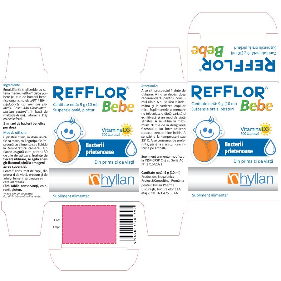 Ingrediente:Emulsifianti: trigliceride cu catena medie; Refflor Bebe pulbere (culturi de bacterii benefice organismului: LAFTI B94 - Bifidobacterium animalis ssp. lactis, Rosell-444 - Limosilactobacillus reuteri, in baza de maltodextrina), vitamina D3 (colecalciferol).