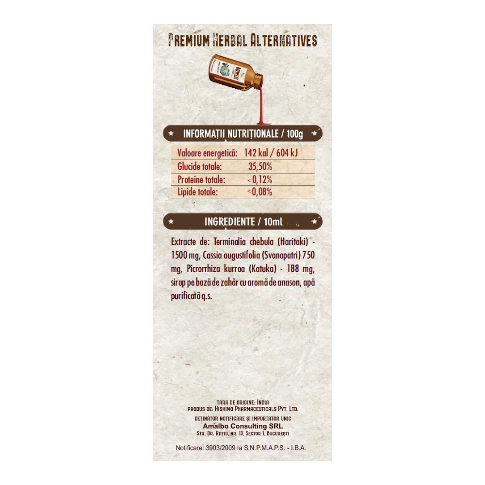 Extracte de: Terminalia chebula (Haritaki) 1500 mg, Cassia augustifolia (Svanapatri) 750 mg, Picrorrhiza kurroa (Katuka) 188 mg, sirop pe bază de zahăr cu aromă de anason, apă purificată q.s.