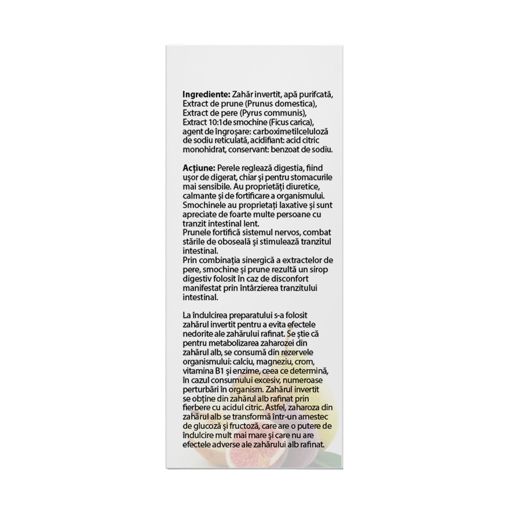 - prin combinatia sinergica a extractelor de pere, smochine si prune rezulta un sirop digestiv folosit in caz de disconfort manifestat prin intarzierea tranzitului intestinal;