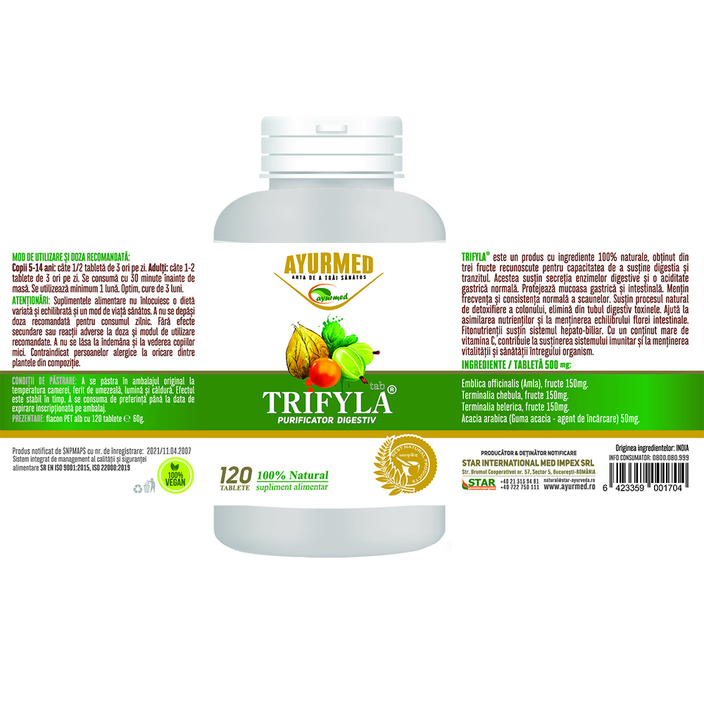 Emblica officinalis (Amla), fructe 150mg. Terminalia chebula, fructe 150mg. Terminalia belerica, fructe 150mg. Acacia arabica (Guma acacia - agent de încărcare) 50mg.