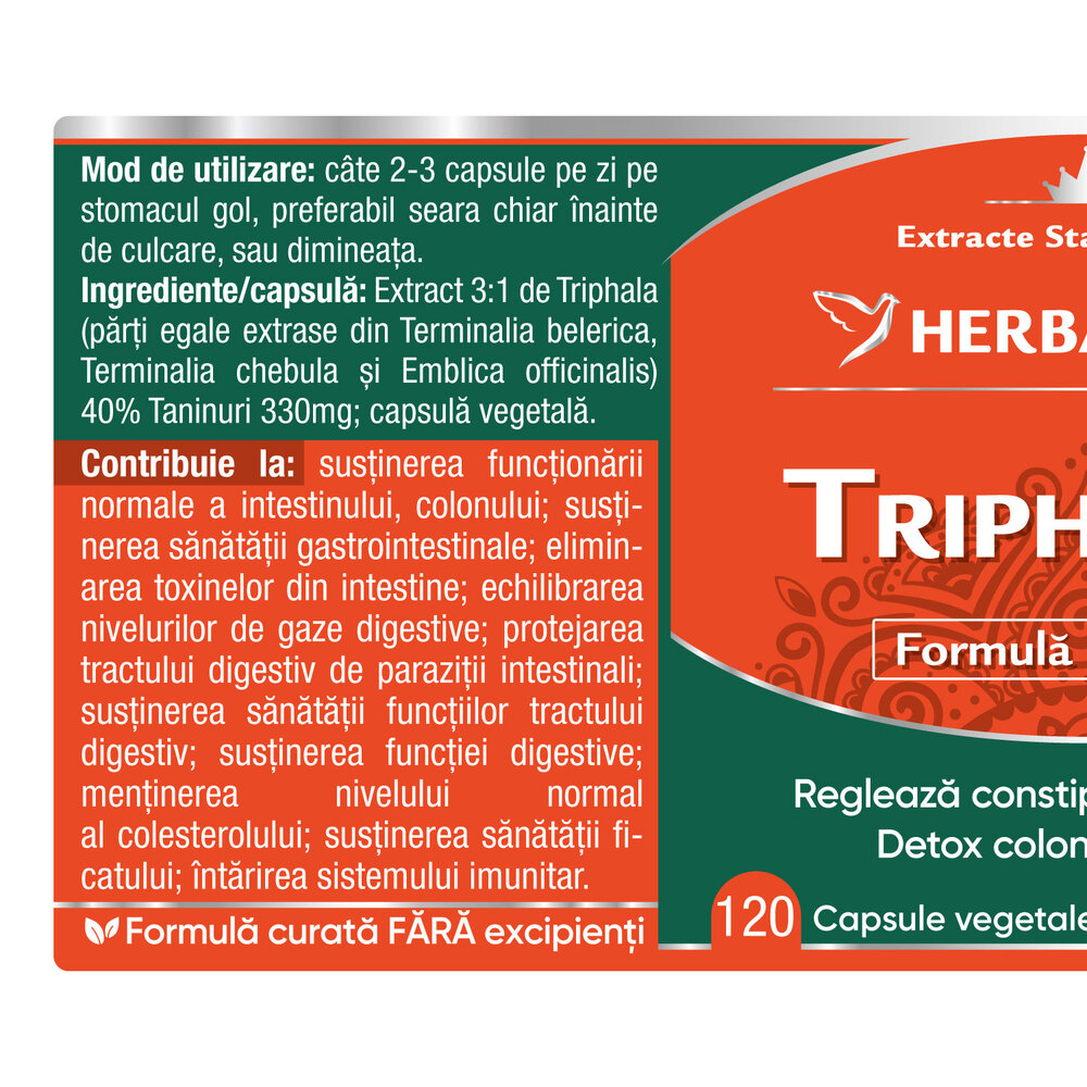 Extract 3:1 de Triphala (parti egale extrase din Terminalia belerica, Terminalia chebula si Emblica officinalis) 40% Taninuri 330 mg; capsula: vegetala.