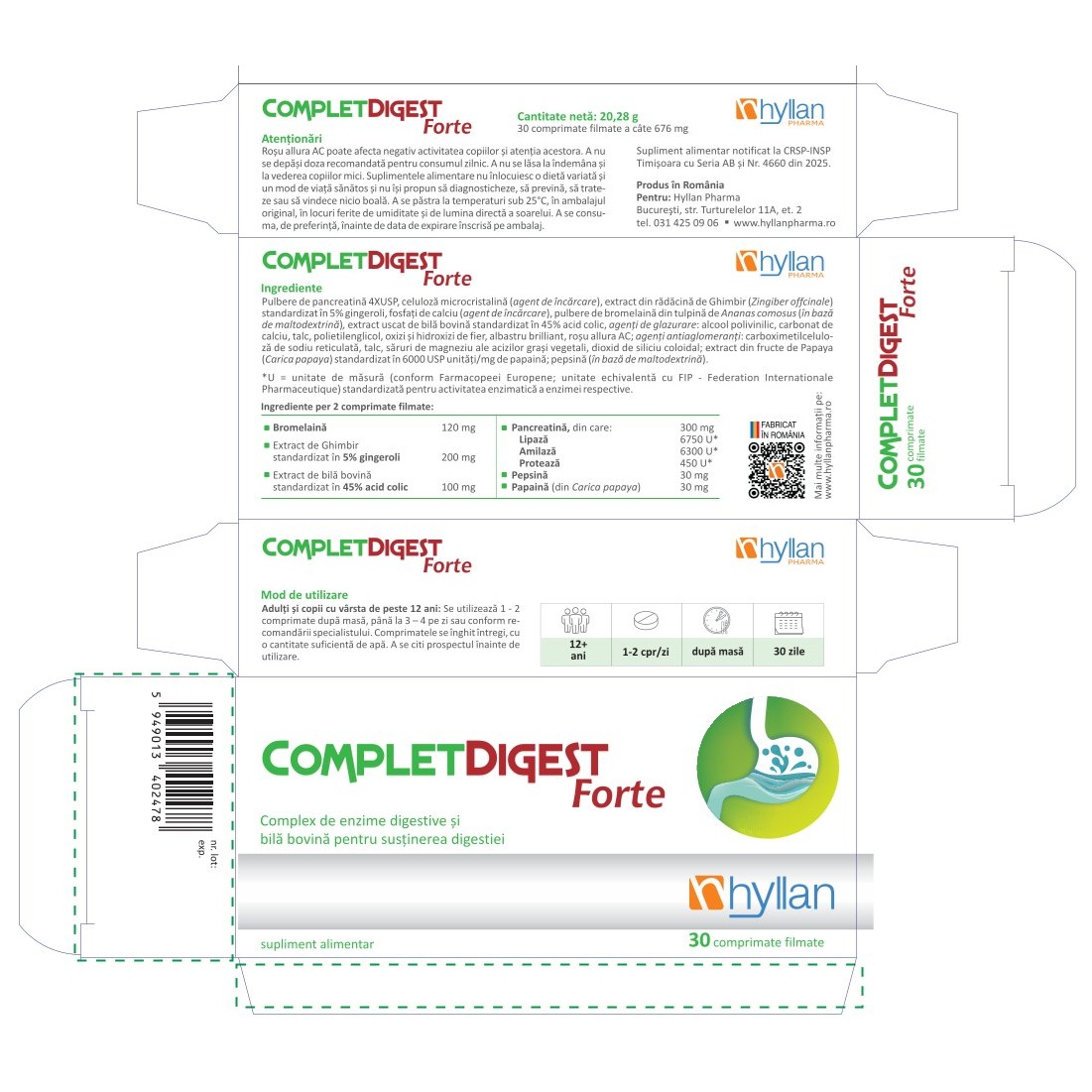 Pulbere de pancreatina 4XUSP, celuloza microcristalina (agent de incarcare), extract din radacina de Ghimbir (Zingiber offcinale) standardizat in 5% gingeroli, fosfati de calciu (agent de incarcare), pulbere de bromelaina din tulpina de Ananas comosus (in baza de maltodextrina), extract uscat de bila bovina standardizat in 45% acid colic, agenti de glazurare: alcool polivinilic, carbonat de calciu, talc, polietilenglicol, oxizi si hidroxizi de fier, albastru brilliant, rosu allura AC; agenti antiaglomeranti: carboximetilceluloza de sodiu reticulata, talc, saruri de magneziu ale acizilor grasi vegetali, dioxid de siliciu coloidal; extract din fructe de Papaya (Carica papaya) standardizat in 6000 USP unitati/mg de papaina; pepsina (in baza de maltodextrina).