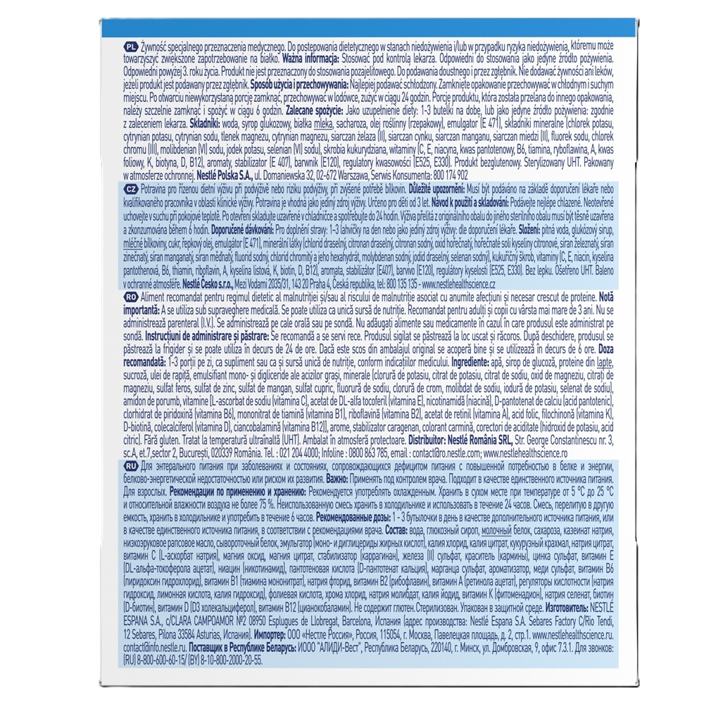 Apa, proteine din lapte, sirop de glucoza, sucroza, ulei de rapita cu continut scazut de acid erucic, minerale (clorura de potasiu, citrat de potasiu, citrat de sodiu, citrati de magneziu, oxid de magneziu, sulfat feros, sulfat de zinc, sulfat de mangan, sulfat cupric, fluorura de sodiu, clorura de crom, molibdat de sodiu, iodura de potasiu, selenat de sodiu), emulgator mono-si digliceride ale acizilor grasi, aroma, amidon, vitamine [L-ascorbat de sodiu (vitamina C), acetat de DL-alfa tocoferil (vitamina E), nicotinamida (niacina), D-pantotenat de calciu (acid pantotenic) , clorhidrat de piridoxina (vitamina B6), acetat de retinil (vitamina A), mononitrat t de tiamina (vitamina B1), riboflavina (vitamina B2), acid folic, filochinona (vitamina K), D-biotina, colecalciferol (vitamina D)], stabilizator caragenan, colorant carmine.