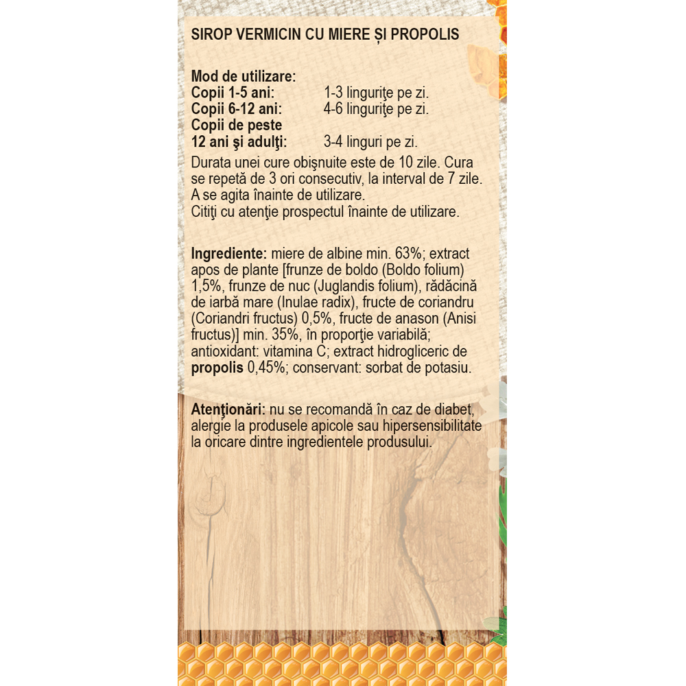 Miere de albine min. 63%; extract apos de plante [frunze de boldo ( Boldo folium) 1.5%, frunze de nuc (Juglandis folium, radacina de iarba mare (Inulae radix), fructe de coriandru (Coriandri fructus) 0.5%, fructe de anason (Anisi fructus)] min. 35% , in proportie variabila; antioxidant: vitamina Cl extract hidrogliceric de propolis 0.45%; conservant: sorbat de potasiu.
