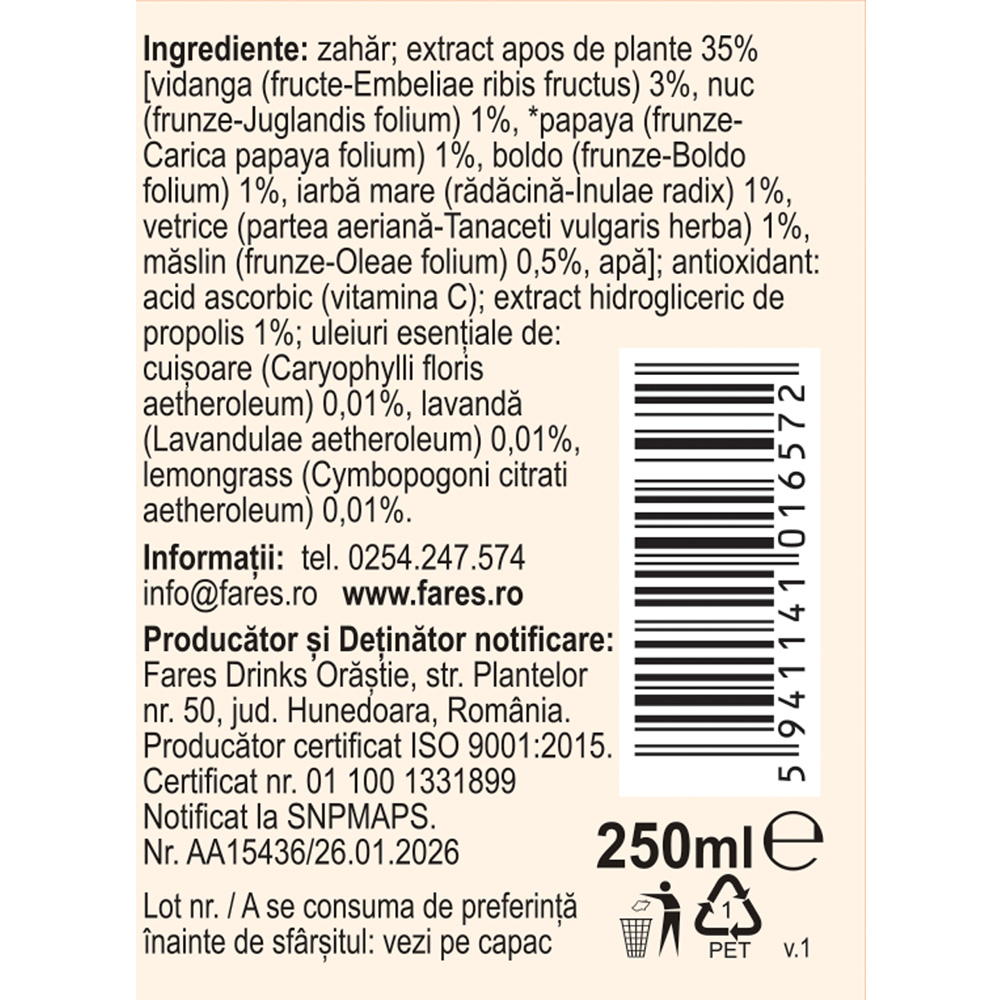 Zahar, extract apos de plante 35% [vidanga (fructe – Embeliae ribis fructus) 3%, nuc (frunze – Juglandis folium) 1%, papaya (frunze – Carica papaya folium) 1%, boldo (frunze – Boldo folium) 1%, iarba mare (radacina – Inulae radix) 1%, vetrice (partea aeriana – Tanaceti vulgaris herba) 1%, maslin (frunze – Oleae folium) 0,5%, apa], antioxidant: acid ascorbic (vitamina C), extract hidrogliceric de propolis 1%, uleiuri esentiale de cuisoare (Caryophylli floris aetheroleum) 0,01%, lavanda (Lavandulae aetheroleum) 0,01%, lemongrass (Cymbopogoni citrati aetheroleum) 0,01%.