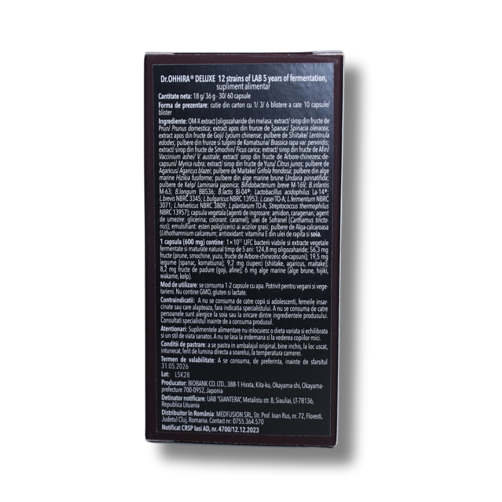 - este un supliment alimentar complex cu probiotice (12 tulpini de bacterii lactice benefice vii si active), prebiotice (14 plante fermentate timp de 5 ani) si postbiotice (peste 500 de metaboliti postbiotici naturali cu biodisponibilitate ridicata);