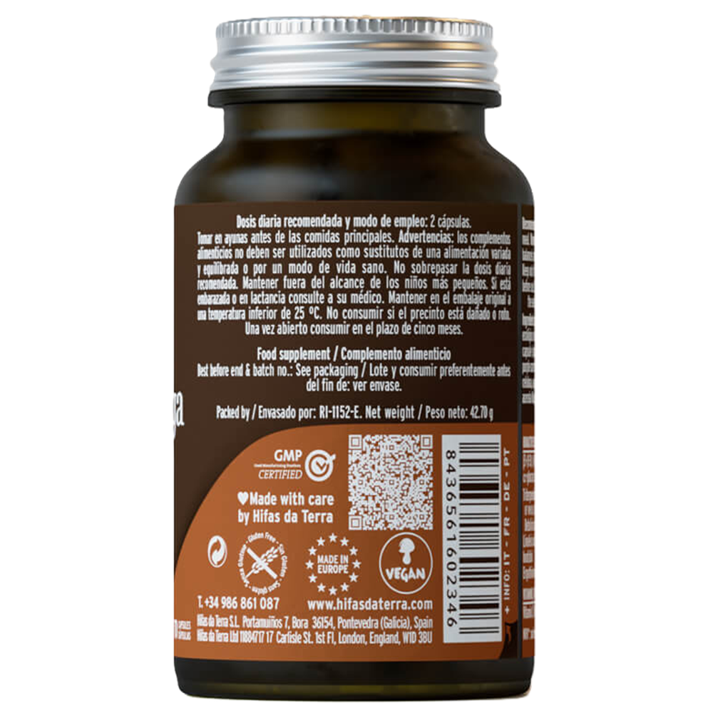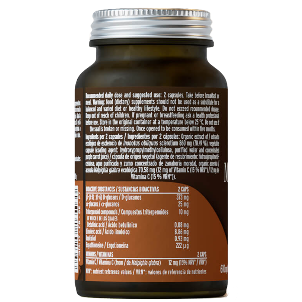 Fiecare capsula contine 430 mg extract ecologic din Inonotus obliquus sclerotium si 35,29 mg acerola ecologica (Malpighia glabra) cu 6 mg vitamina C, capsula 100% vegetala: hidroxipropilmetilceluloza, apa purificata, suc concentrat de morcov violet.