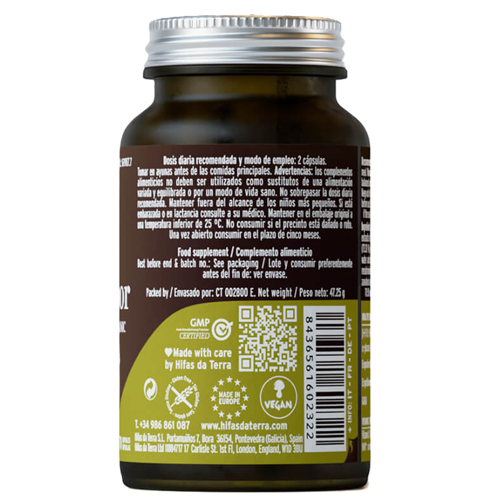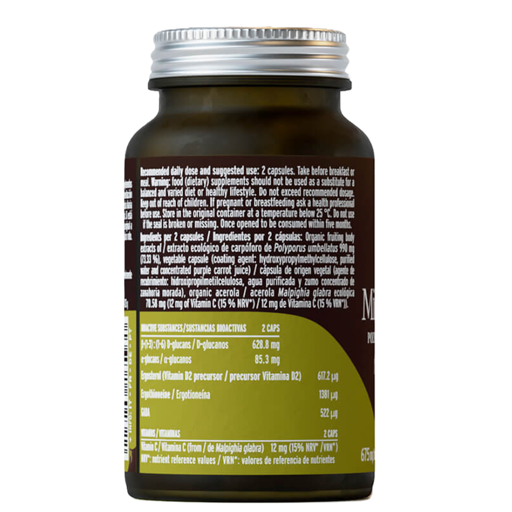 Fiecare capsula contine 495 mg extract ecologic din corp fructifer de Polyporus (Polyporus umbellatus), 35,29 mg acerola ecologica (Malpighia glabra) cu 6 mg vitamina C, capsula 100% vegetala: hidroxipropilmetilceluloza, apa purificata, suc concentrat din morcovi violet.
