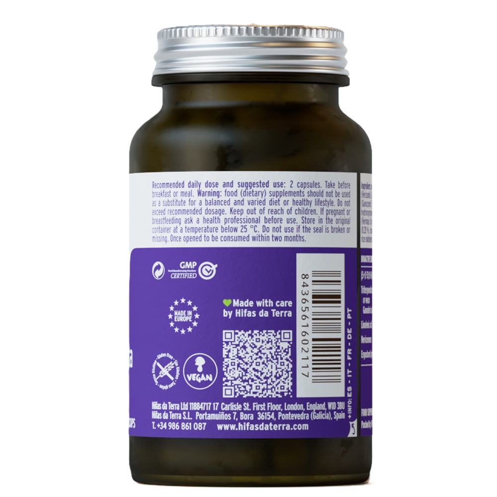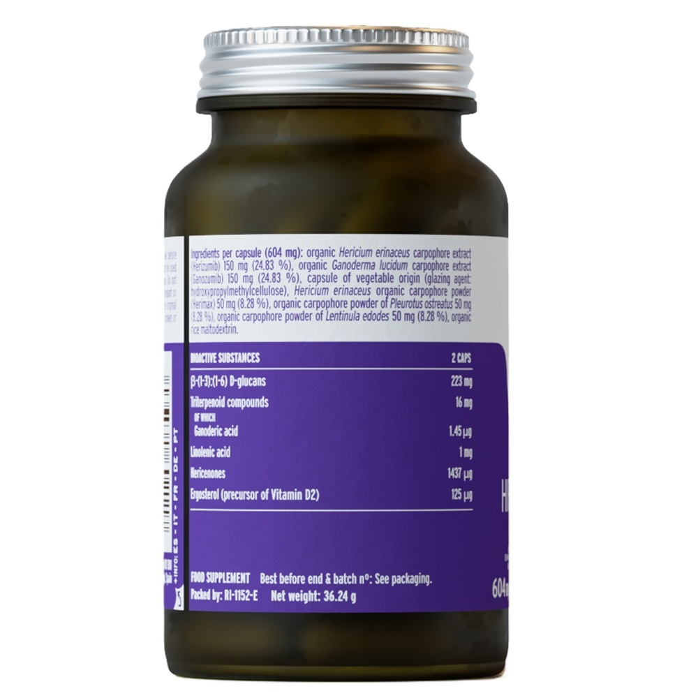 Fiecare capsula contine 150 mg extract ecologic din carpofor de Hericium erinaceus (Herizumib), 150 mg extract ecologic din carpofor de Ganoderma lucidum (Ganozumib), 50 mg pulbere ecologica din carpofor de Hericium erinaceus (Herimax), 50 mg pulbere ecologica din carpofor de Pleurotus ostreatus si 50 mg pulbere ecologica din carpofor de Lentinula edodes, maltodextrina ecologica din orez, capsula vegetala din hidroxipropilmetilceluloza.