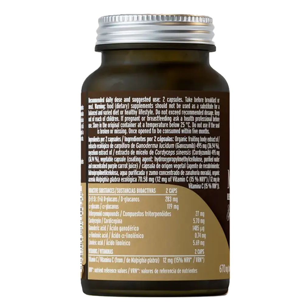- extractele din Reishi si Cordyceps furnizeaza o varietate de compusi bioactivi prezenti in mod natural, printre care: beta-glucani (β-1,3 / β-1,6 D-glucani), alfa-glucani, compusi triterpenoizi, ergosterol, cordycepina, acizi ganoderici, acid alfa-linolenic;