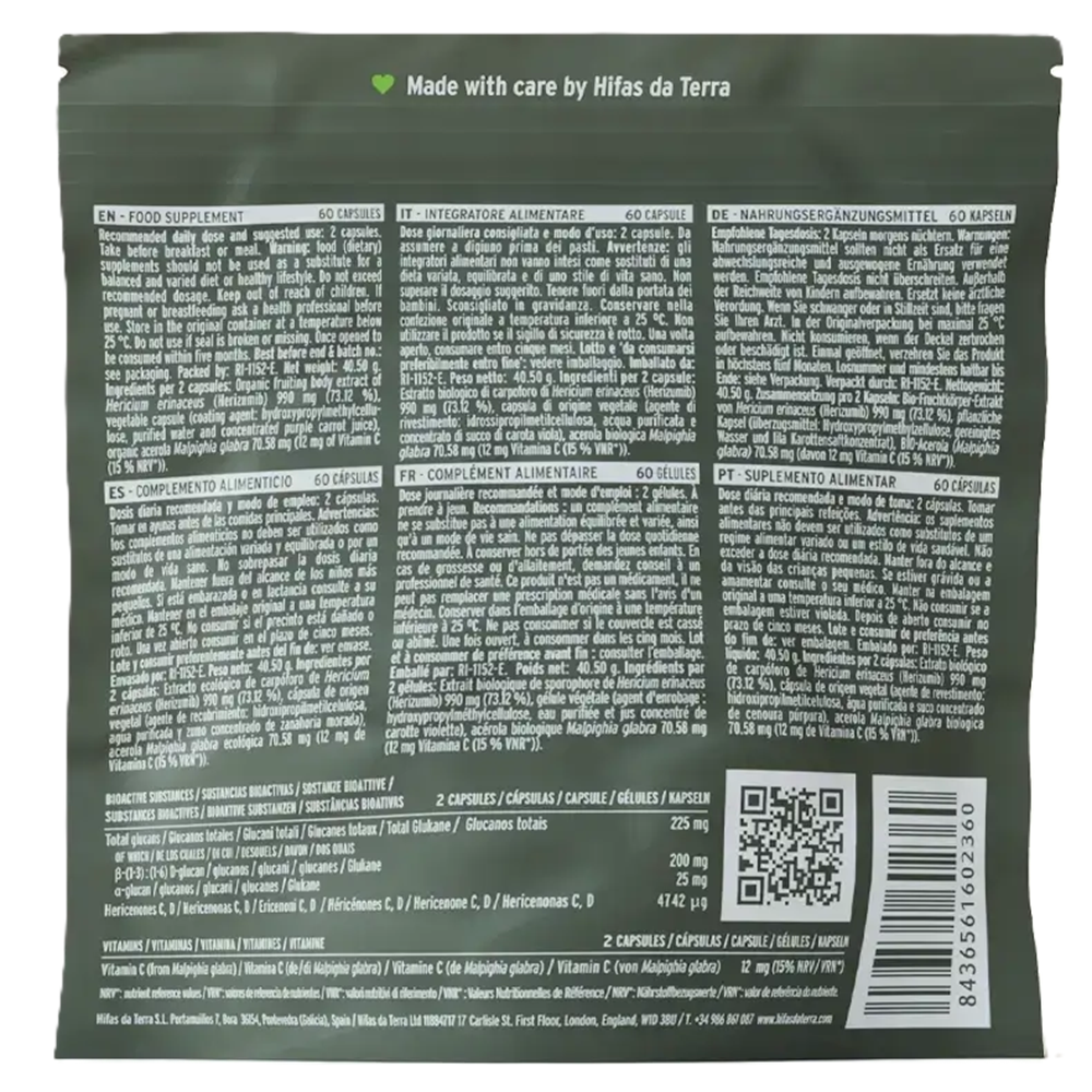 Ingrediente per capsula (70 capsule): Fiecare capsula contine 495 mg extract ecologic din corp fructifer de Coama de leu (Hericium erinaceus) Herizumib, 35,29 mg acerola ecologica (Malpighia glabra) cu 6 mg vitamina C.