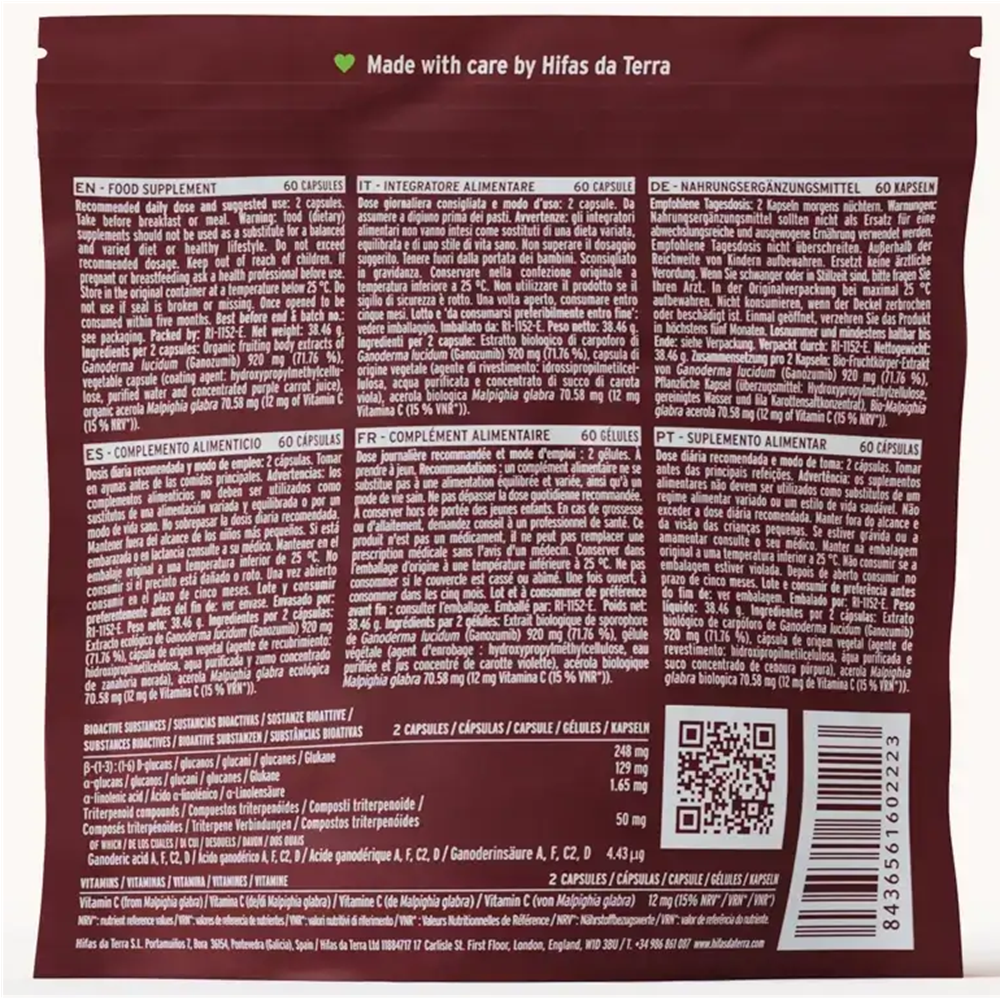 Fiecare capsula contine extract ecologic din corp fructifer de Ganoderma lucidum (Ganozumib) 460 mg, 35,29 mg acerola ecologica (Malpighia glabra) cu 6 mg vitamina C. Capsula 100% vegetala: hidroxipropilmetilceluloza, apa purificata, suc concentrat de morcov violet.