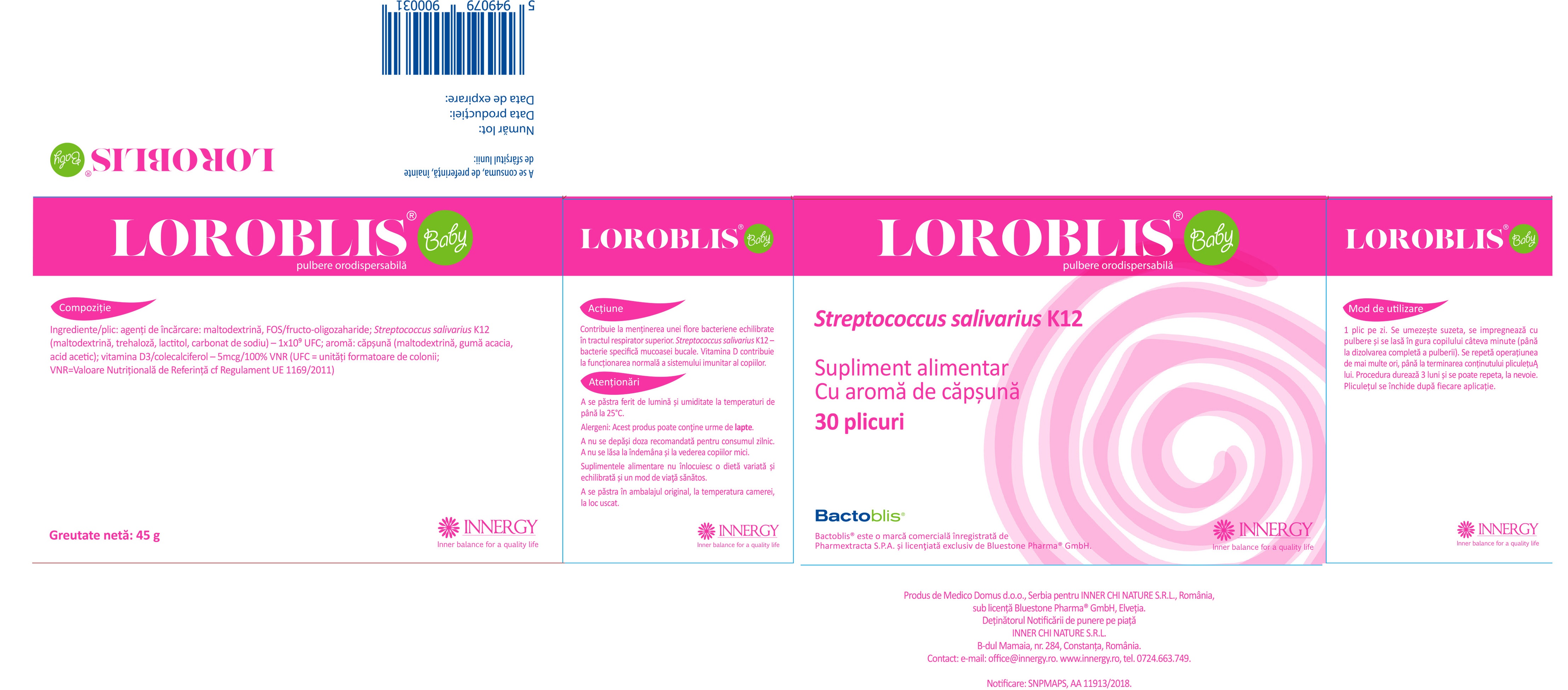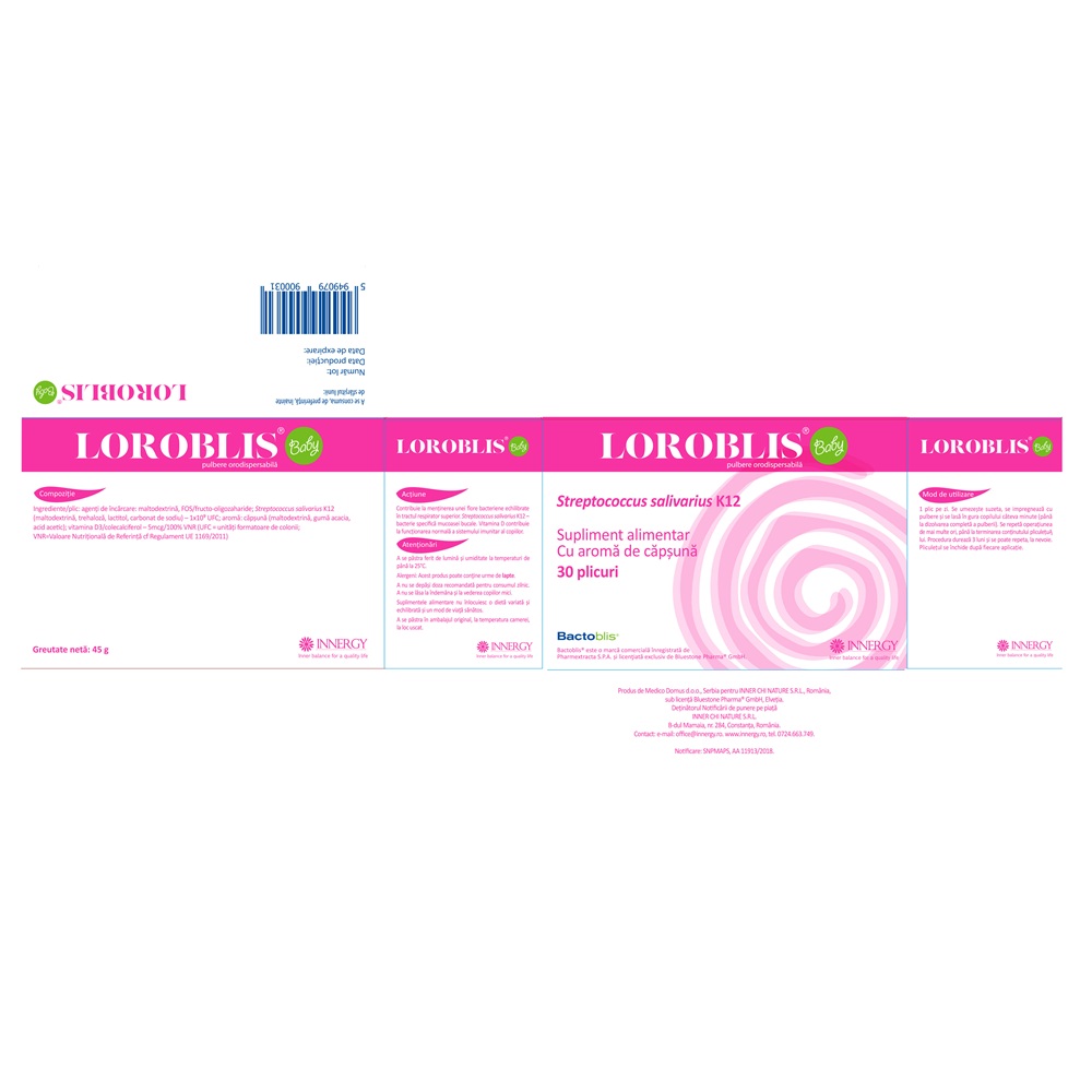 ingrediente/plic: agenti de incarcare: maltodextrina; FOS/fructo-oligozaharide; Streptococcus salivarius K12 (maltodextrina, trehaloza, lactitol, carbonat de sodiu) – 1 x 10⁹ UFC; aroma: capsuna (maltodextrina, guma acacia, acid acetic); vitamina D3/colecalciferol 5mcg/100% VNR (UFC = unitati formatoare de colonii;