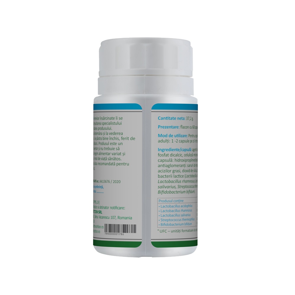 Ingrediente:Agenti de incarcare: fosfat dicalcic, celuloza microcristalina, capsula: hidroxipropilmetilceluloza, agenti antiaglomeranti: saruri de magneziu ale acizilor grasi, dioxid de siliciu, colonii de bacterii lactice (Lactobacillus acidophilus, Lactobacillus rhamnosus, Lactobacillus salivarius, Streptococcus thermophilus, Bifidobacterium bifidum).