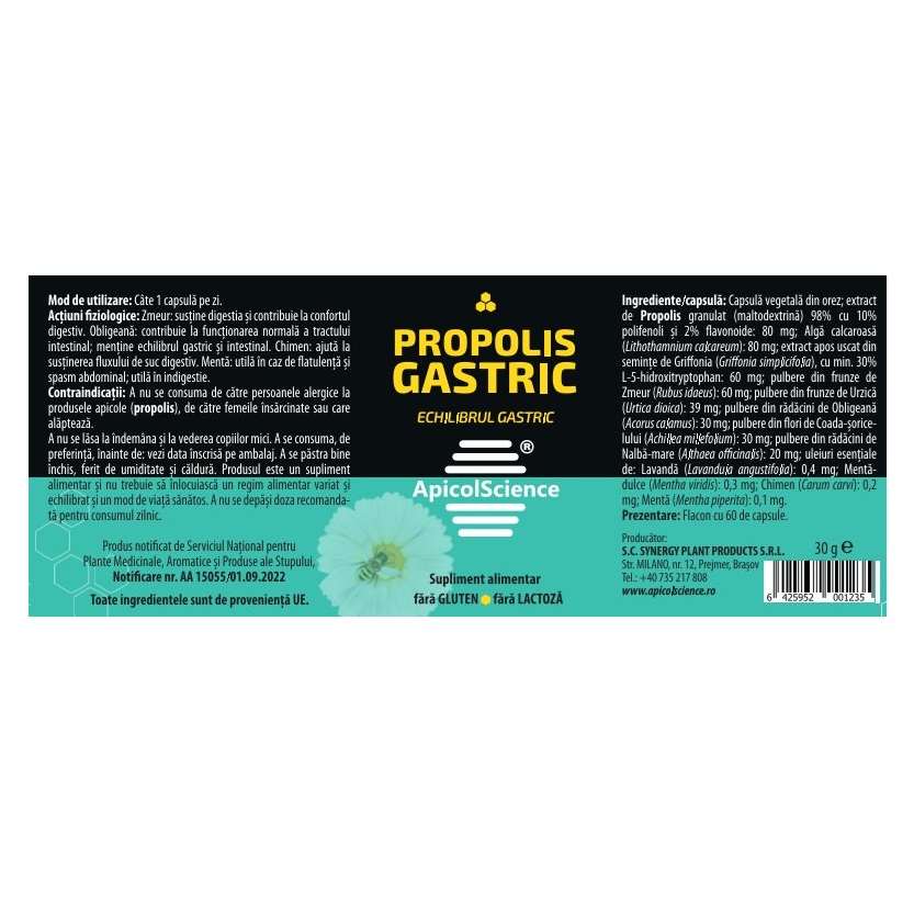 Ingrediente:Capsula vegetala din orez; extract de Propolis granulat (maltodextrina) 98% cu 10% polifenoli si 2% flavonoide: 80 mg; Alga calcaroasa (Lithothamnium calcareum): 80 mg; extract apos uscat din seminte de Griffonia (Griffonia simplicifolia), cu min. 30% L-5-hidroxitryptophan: 60 mg; pulbere din frunze de Zmeur (Rubus idaeus): 60 mg; pulbere din frunze de Urzica (Urtica dioica): 39 mg; pulbere din radacini de Obligeana (Acorus calamus): 30 mg; pulbere din flori de Coada-soricelului (Achillea millefolium): 30 mg; pulbere din radacini de Nalba-mare (Althaea officinalis): 20 mg; uleiuri esentiale de: Lavanda (Lavandula angustifolia): 0,4 mg; Menta-dulce (Mentha viridis): 0,3 mg; Chimen (Carum carvi): 0,2 mg; Menta (Mentha piperita): 0,1 mg.