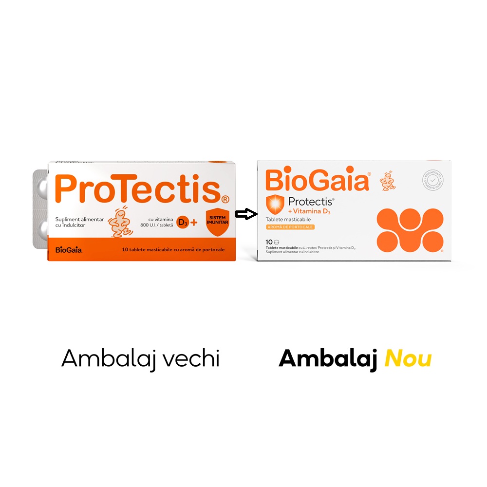 BioGaia ProTectis cu vitamina D3, tablete masticabile cu aromă de portocale, este un supliment alimentar care conţine Lactobacillus reuteri Protectis ® * (L. reuteri DSM 17938), patent al companiei BioGaia, Suedia. L. reuteri Protectis suplimentează flora intestinală prin aportul de lactobacili vii, contribuind astfel la restabilirea și menţinerea echilibrului acesteia. Vitamina D contribuie la funcționarea normală a sistemului imunitar, la menținerea sănătății sistemului osos, la menținerea funcției normale a sistemului muscular, precum și la menţinerea