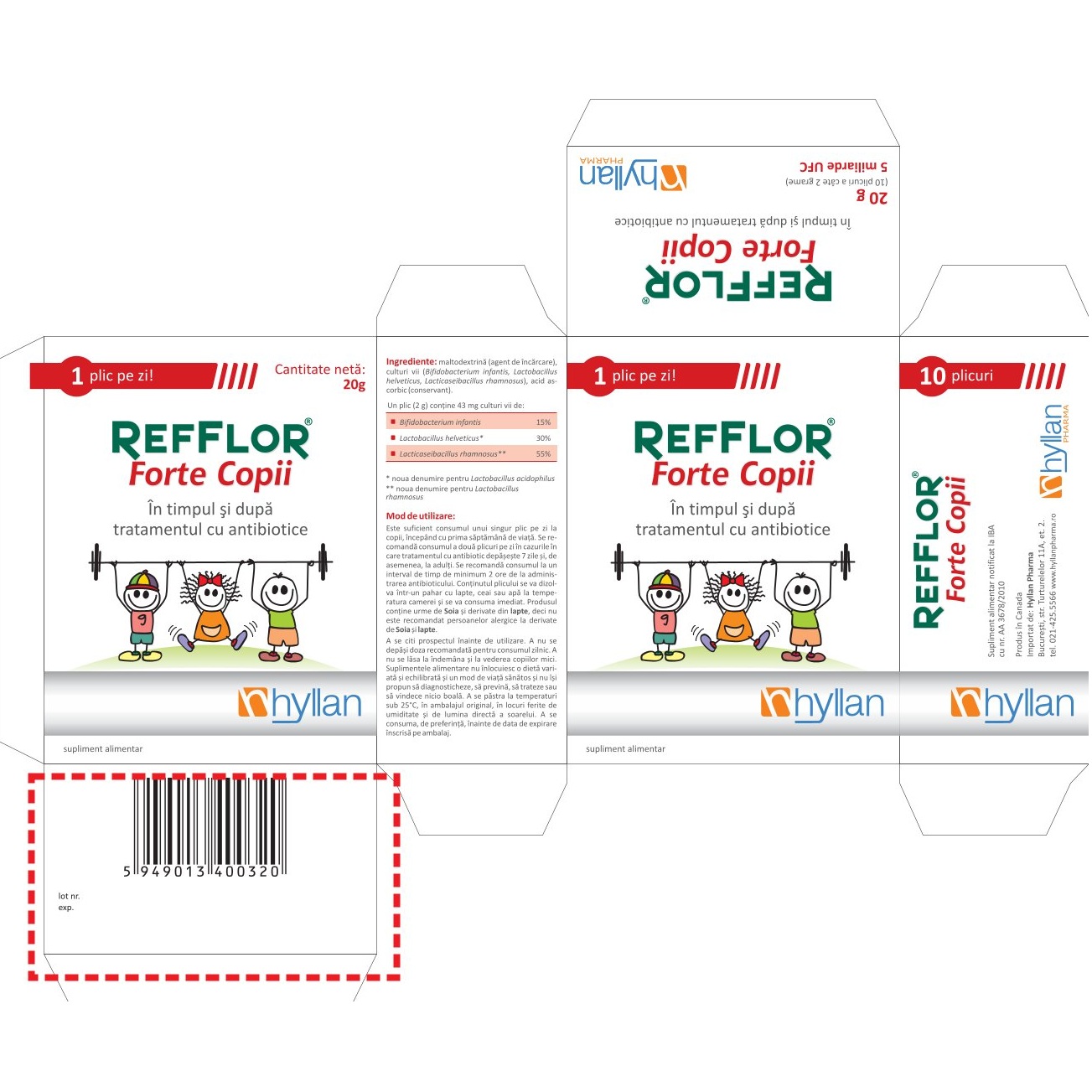 Mod de administrare:Este suficient consumul unui singur plic pe zi la copii, incepand cu prima saptamana de viata. Se consuma doua plicuri pe zi in cazurile in care tratamentul cu antibiotic depaseste 7 zile si, de asemenea, la adulti. Se recomanda consumul la un interval de timp de minimum 2 ore de la administrarea antibioticului.