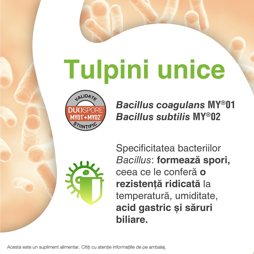 Bacillus coagulans MY®01; Bacillus subtilis MY®02; Extract din rizom de ghimbir (Zingiber officinale Roscoe); Agent de glazurare: acid stearic; Agent antiaglomerant: carbonat de calciu [nano], fosfat tricalcic [nano].
