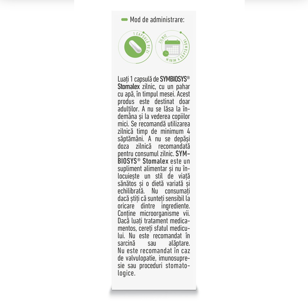 Produsul este destinat doar adulților. A nu se lăsa la îndemâna și la vederea copiilor mici. A nu se depăși doza zilnică recomandată. Symbiosys® Stomalex este un supliment alimentar și nu înlocuiește un stil de viață sănătos și o dietă variată și echilibrată. Nu consumați dacă știți că sunteți sensibil la oricare dintre ingrediente. Conține microorganisme vii. Dacă luați tratament medicamentos, cereți sfatul medicului. Nu este recomandat în sarcină sau alăptare. Nu este recomandat în caz de valvulopatie, imunosupresie sau proceduri stomatologice.