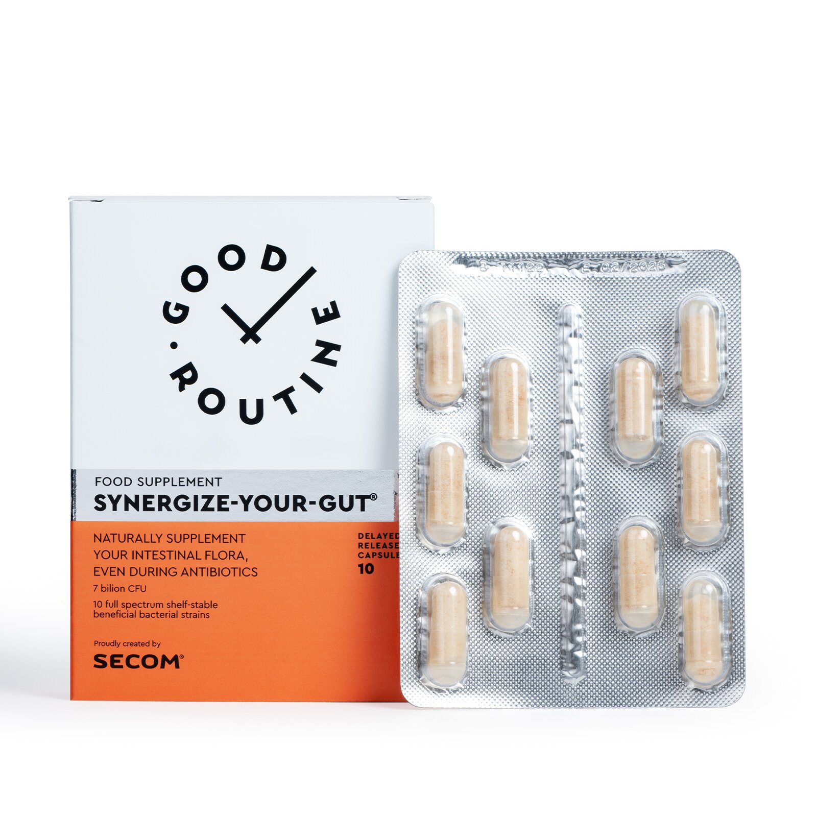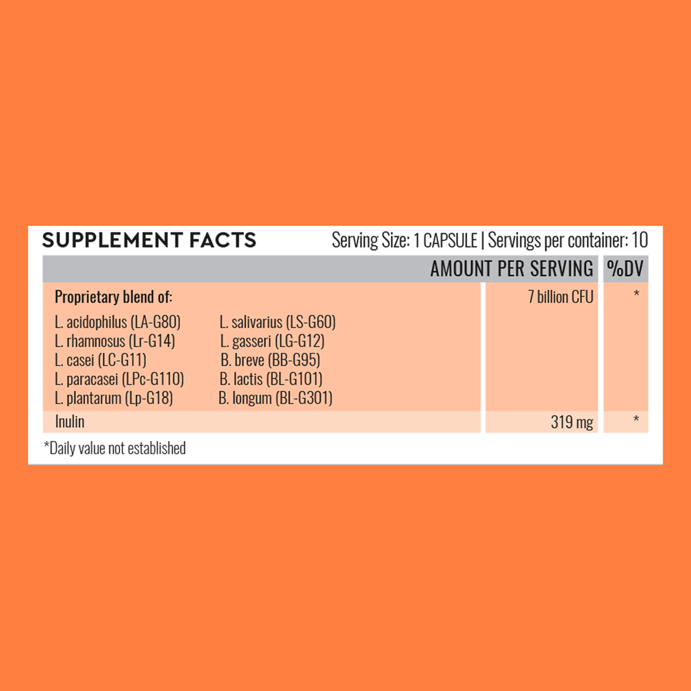 Ingrediente:Per 1 capsula: inulina (din radacina de Cicoare/Cichorium intybus)(fibre solubile) 319mg, hidroxipropilmetilceluloza (capsula vegetala), amestec de 10 tulpini bacteriene benefice, 7 miliarde UFC (unitati formatoare de colonii) (Lactobacillus acidophilus (LA-G80), Lactobacillus rhamnosus (Lr-G14), Lactobacillus casei (LC-G11), Lactobacillus gasseri (LG-G12), Bifidobacterium longum (BL-G301), Lactobacillus plantarum (Lp-G18), Lactobacillus salivarius (LS-G60), Lactobacillus paracasei (LPc-G110), Bifidobacterium breve (BB- G95), Bifidobacterium lactis (BL-G101), saruri de magneziu ale acilor grasi vegetali (agent antiaglomerant), dioxid de siliciu coloidal (agent antiaglomerant).