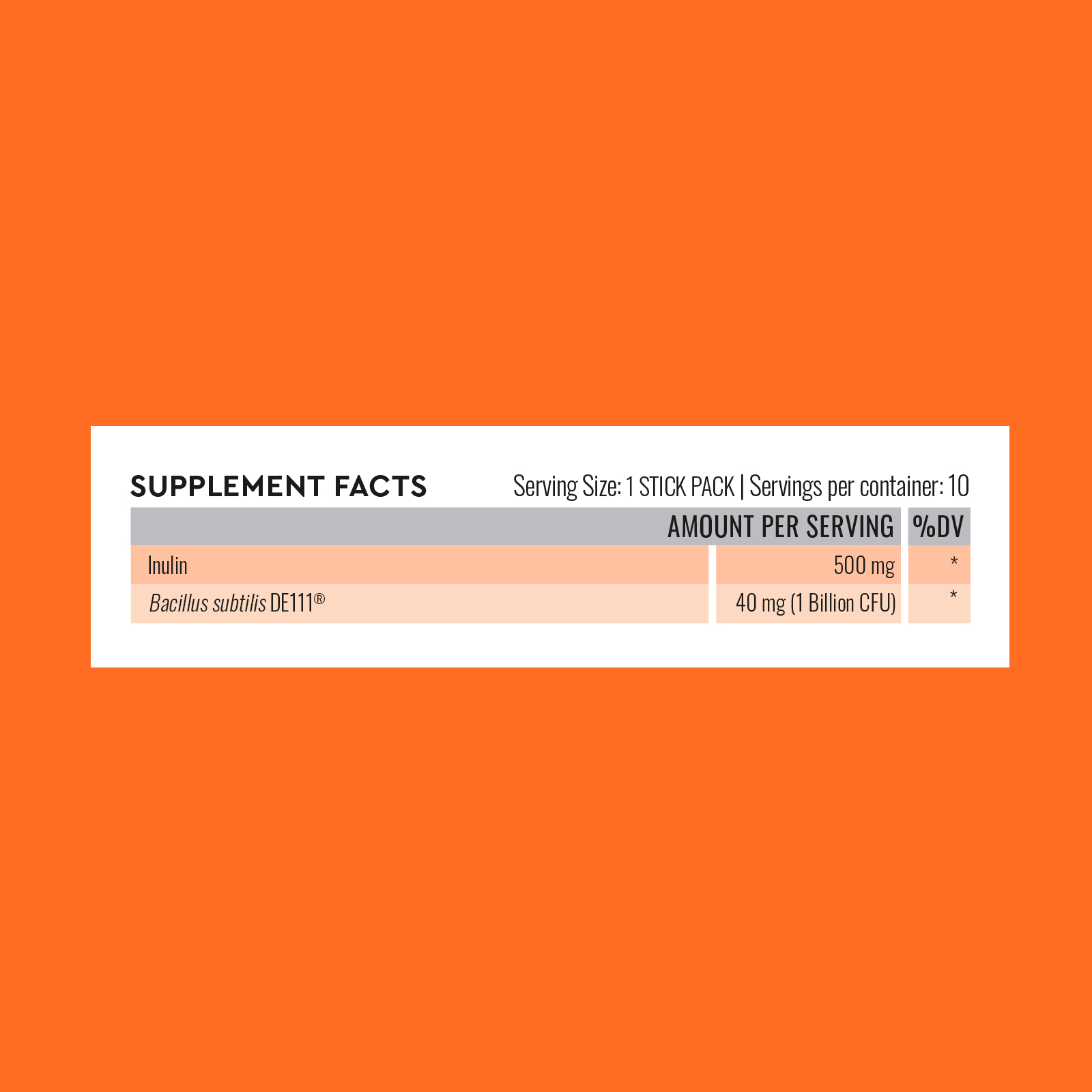 Per 1 plic: inulina (Cichorium intybus)(extract din radacina) 500 mg, maltodextrina(agent de incarcare), eritritol (indulcitor), dioxid de siliciu (agent antiaglomerant), Bacillus subtilis DE111® 40 mg (furnizand 1 miliard UFC*), aroma de cafea, sucraloza (indulcitor) .* UFC-unitati formatoare de colonii.