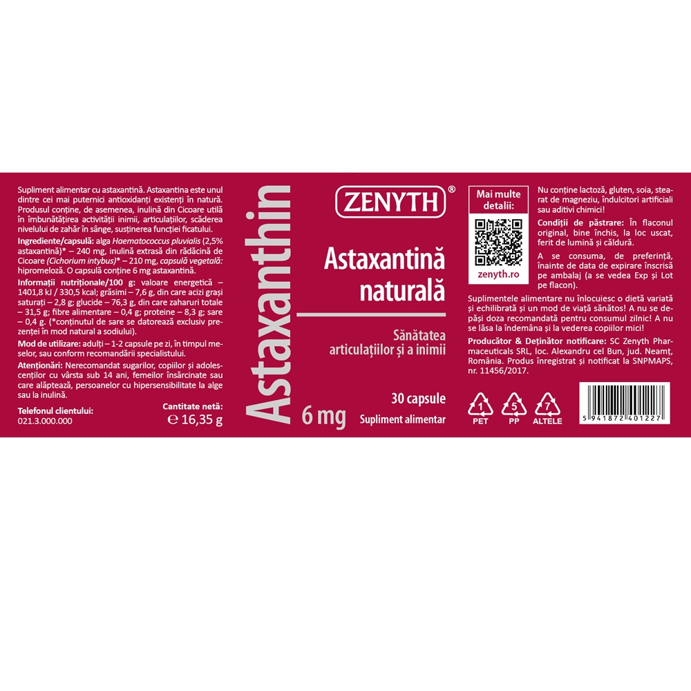 Informatii despre Astaxanthin, 6 mg, 30 capsule, Zenyth s-ar putea gasi in articolele: .