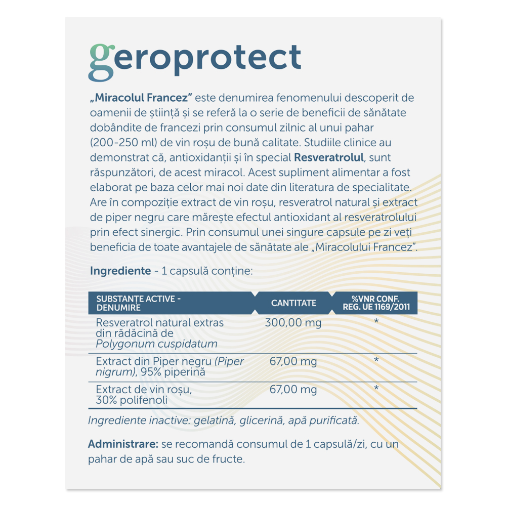 - suplimentul are in compozitie extract de vin rosu si extract de piper negru, care pot contribui la sustinerea rolului antioxidant al resveratrolului printr-un efect sinergic;
