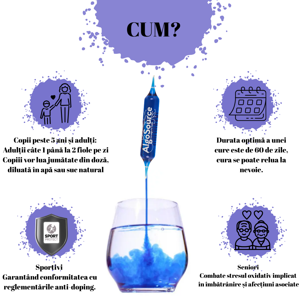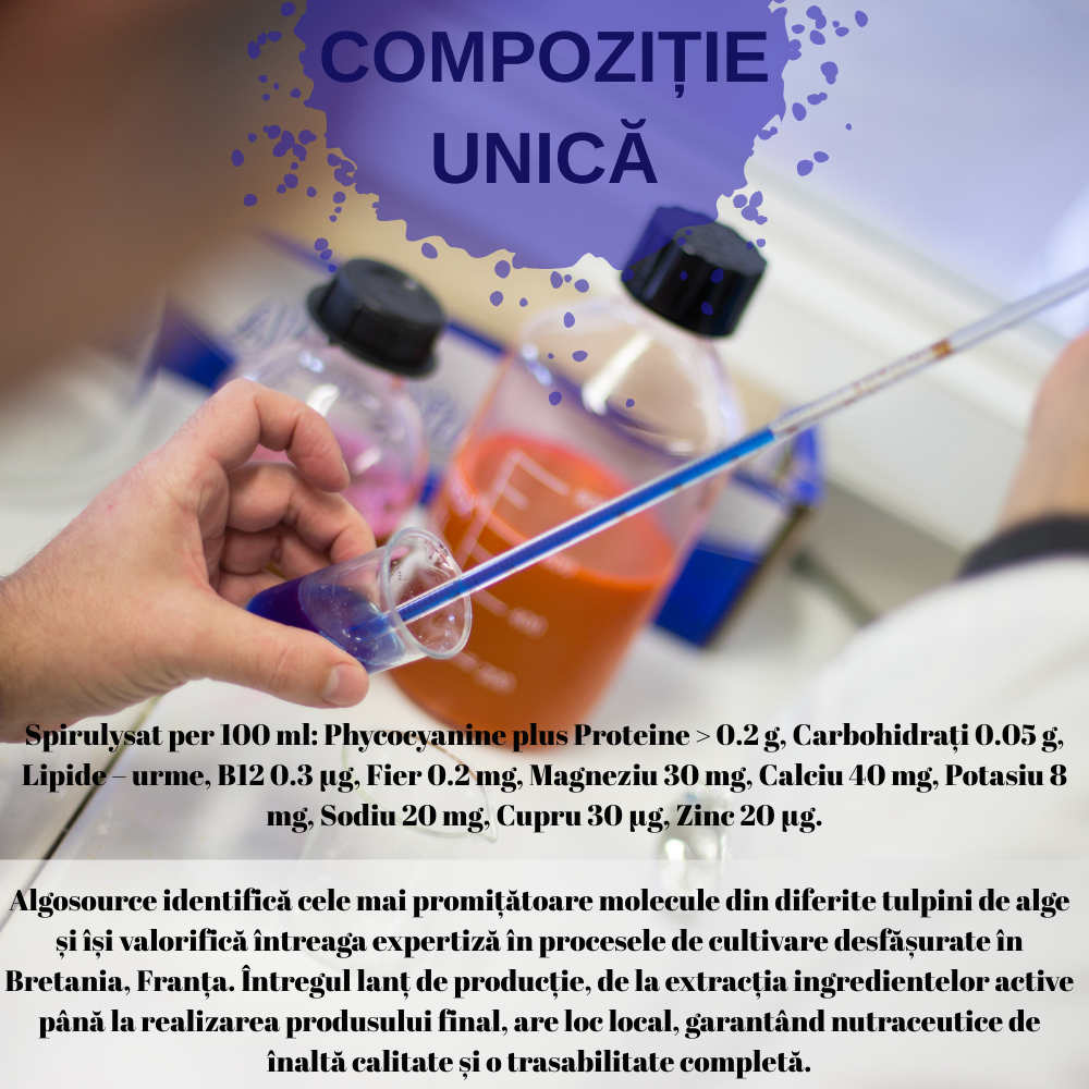 | Extract lichid de Spirulină (Arthrospira platensis) | 20 mg (echivalent 100 mg/100 ml) | Bogat în phycocianine |