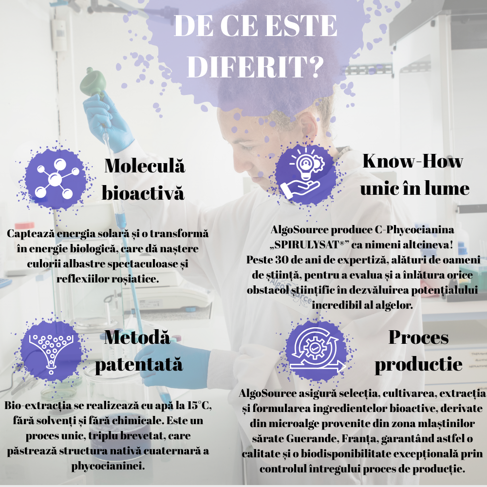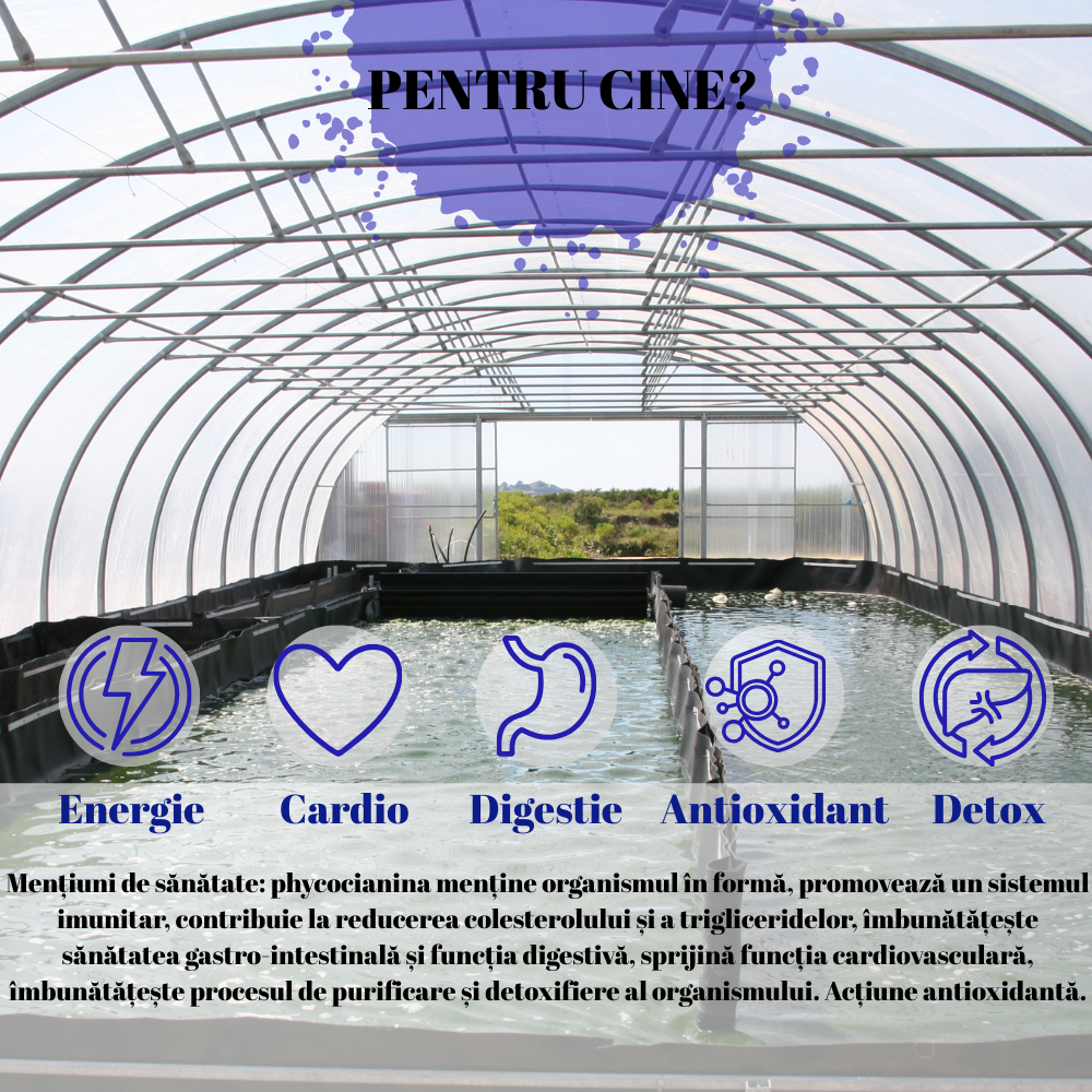 - puterea Phycocianinei: principalul compus bioactiv al spirulinei şi motorul energetic" al acesteia, conferă extractului culoarea albastră intense;