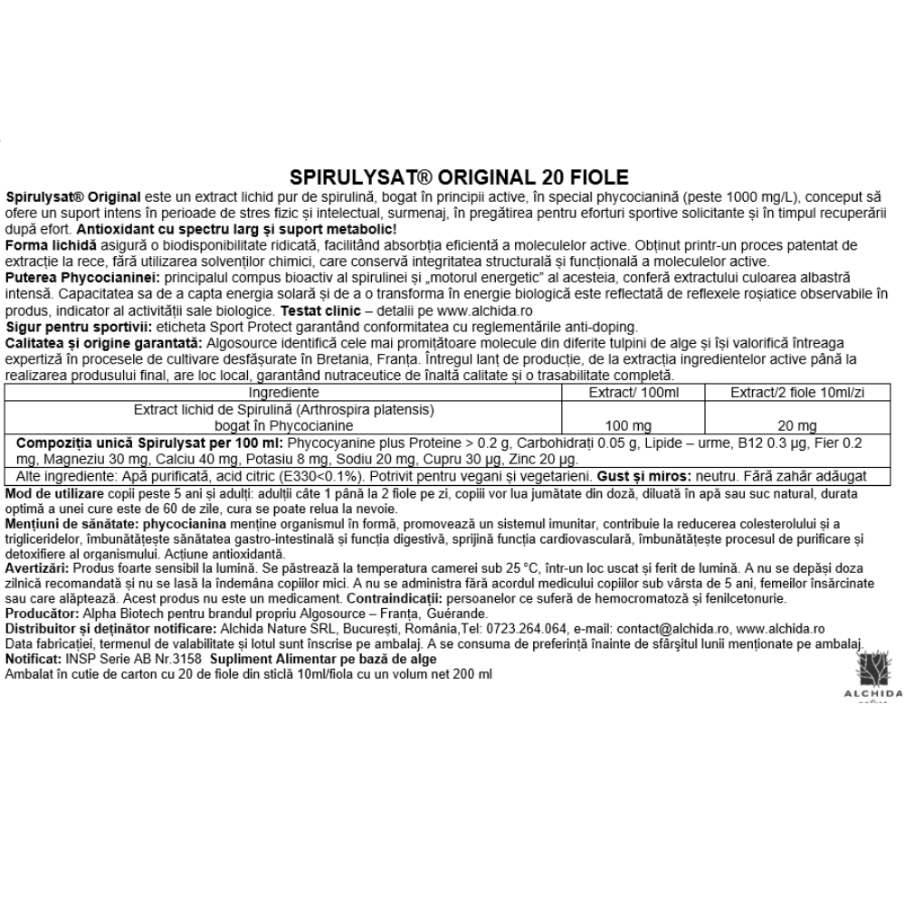 - Spirulysat Original este un extract lichid pur de spirulină, bogat în principii active, în special phycocianină (peste 1000 mg/L), conceput să ofere un suport intens în perioade de stres fizic și intelectual, surmenaj, în pregătirea pentru eforturi sportive solicitante și în timpul recuperării după effort. Antioxidant cu spectru larg și suport metabolic!