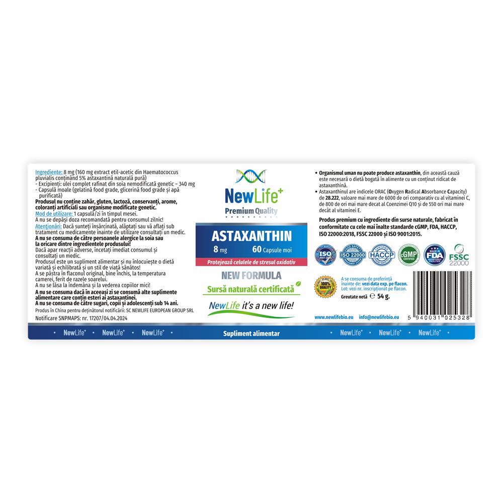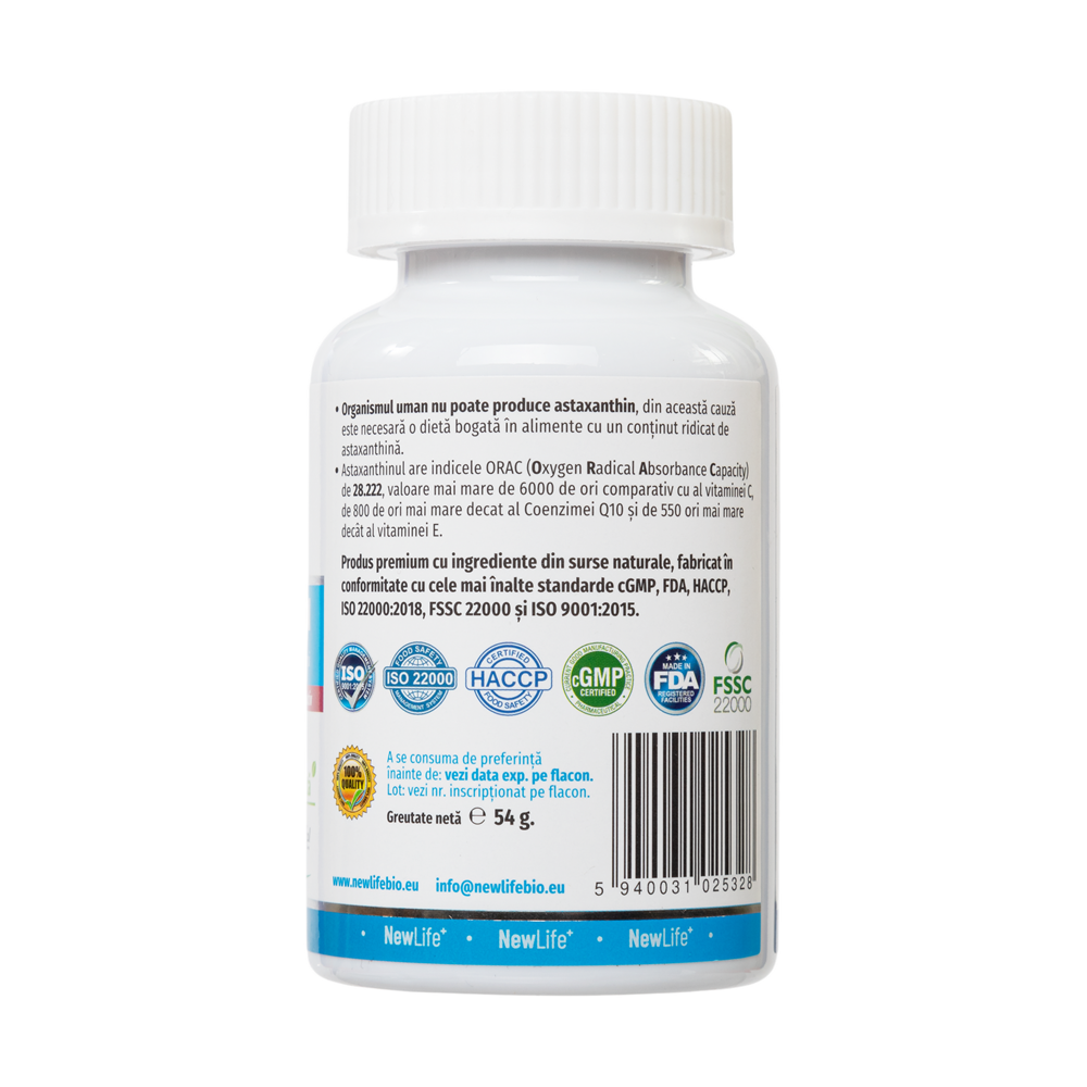 Astaxanthinul are indicele ORAC (Oxygen Radical Absorbance Capacity) de 28.222, valoare mai mare de 6000 de ori comparativ cu al vitaminei C, de 800 de ori mai mare decat al Coenzimei Q10 și de 550 ori mai mare decât al vitaminei E.